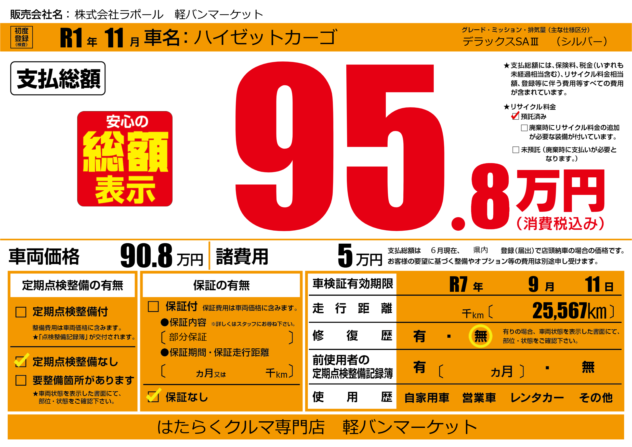 なし | 車検制限 | R7年9月11月 |