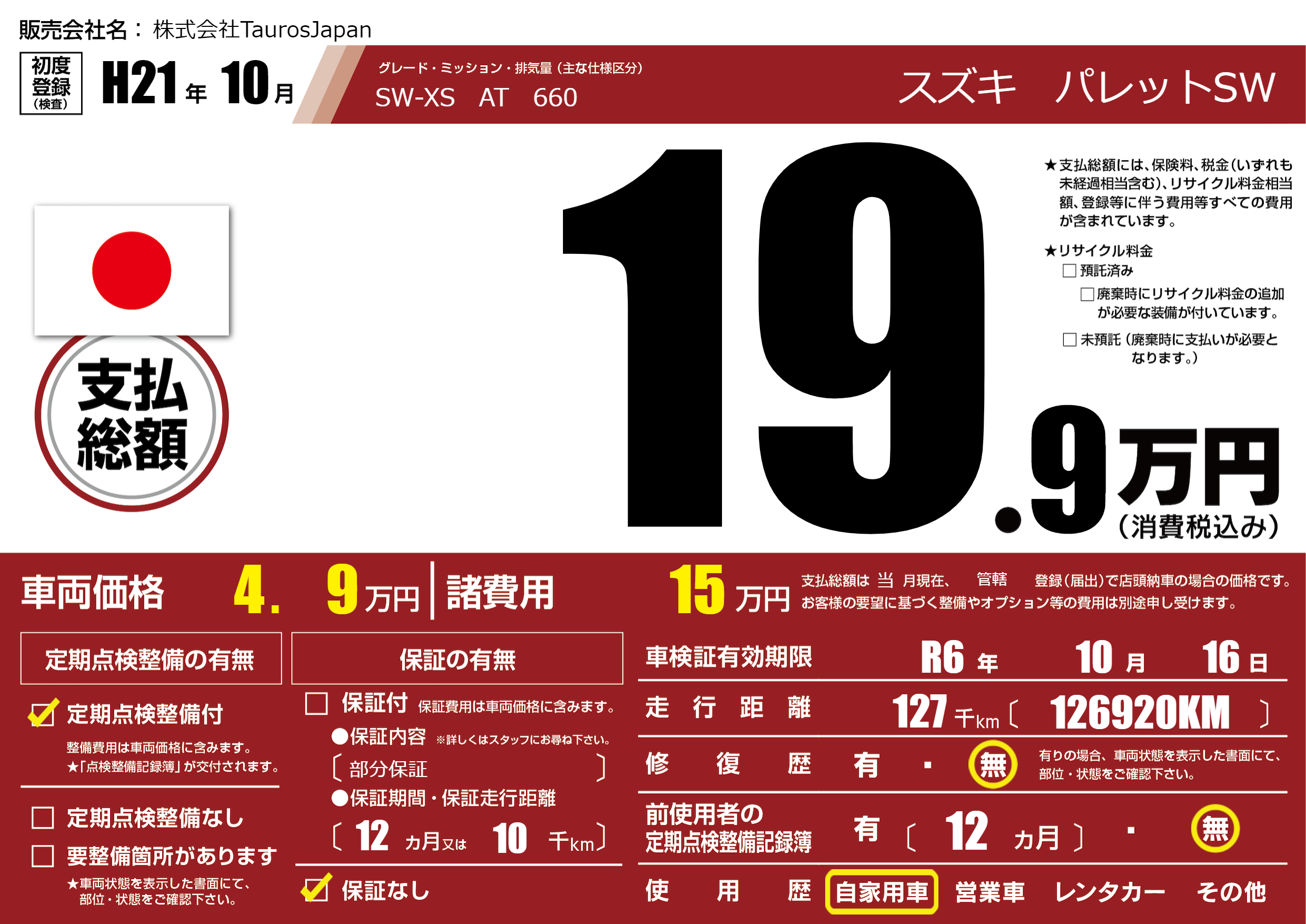 | 車名 | スズキ パレットSW | グレード ミッション 排気量 |