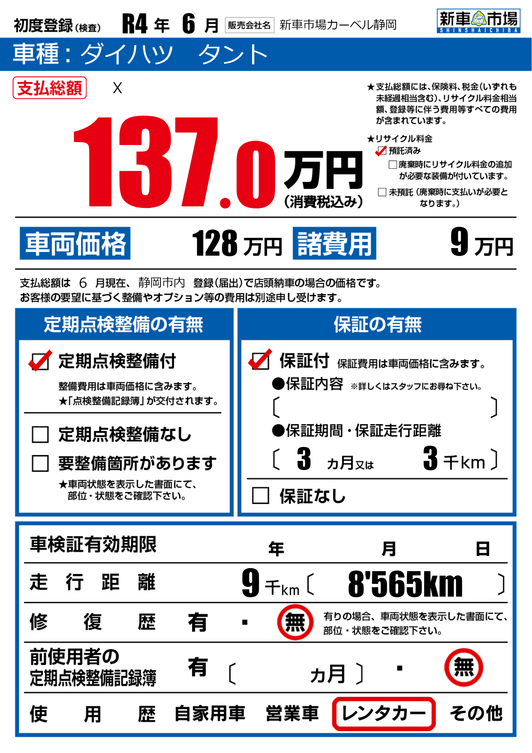 | 走行キロ | 0.9万km | 初年度登録 | R4年6月 |