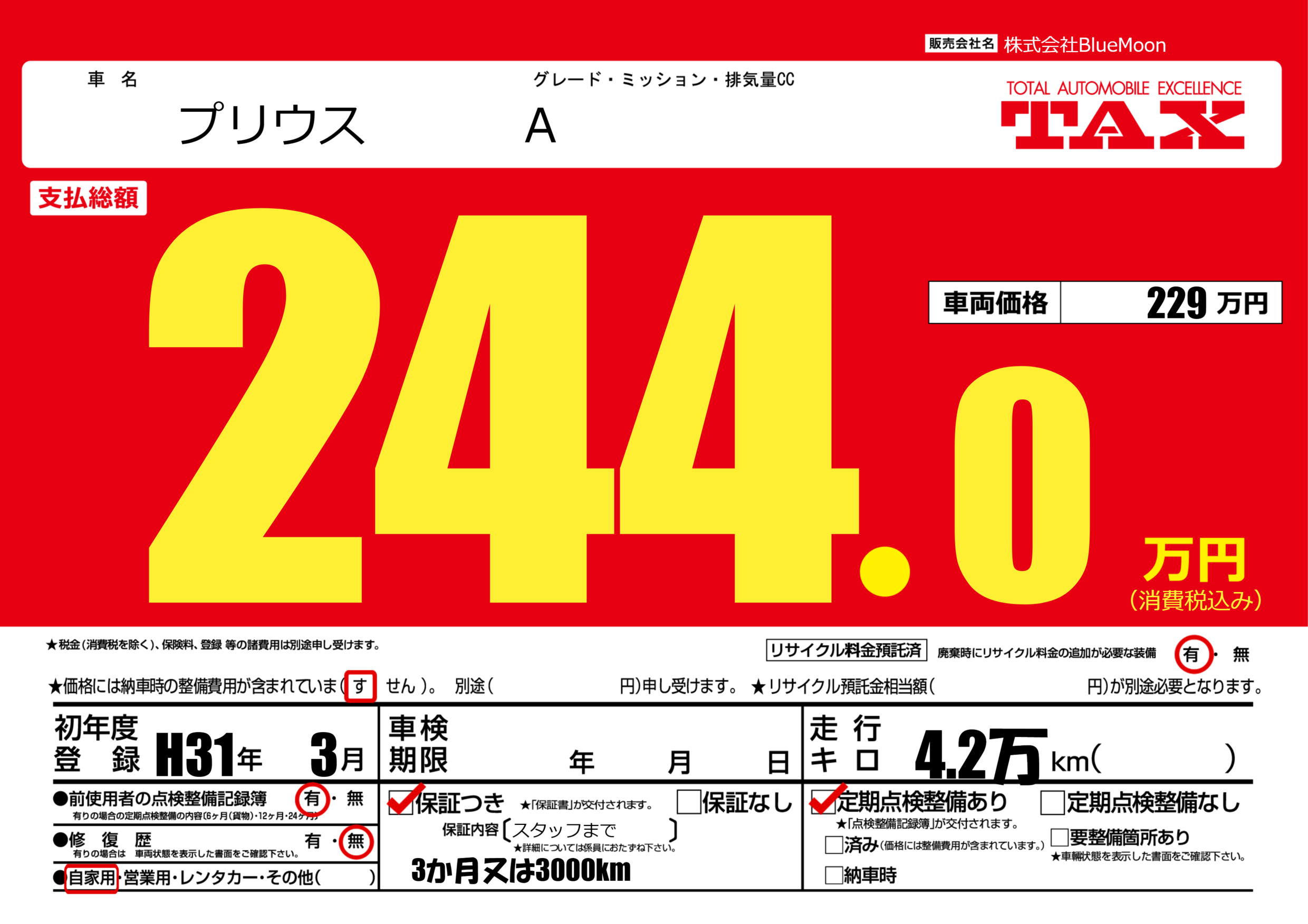 | 車名 | プリウス | グレード ミッション 排気量 |