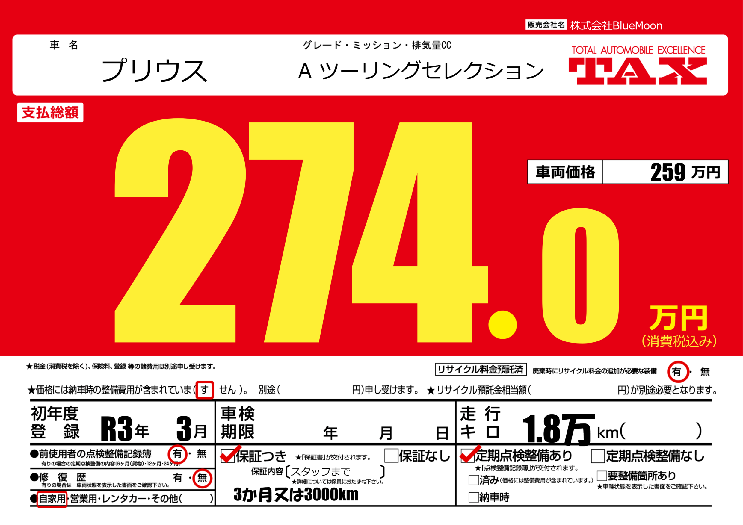 保証付き 保証内容(スタッフまで) ---ヶ月または()千kmまで |