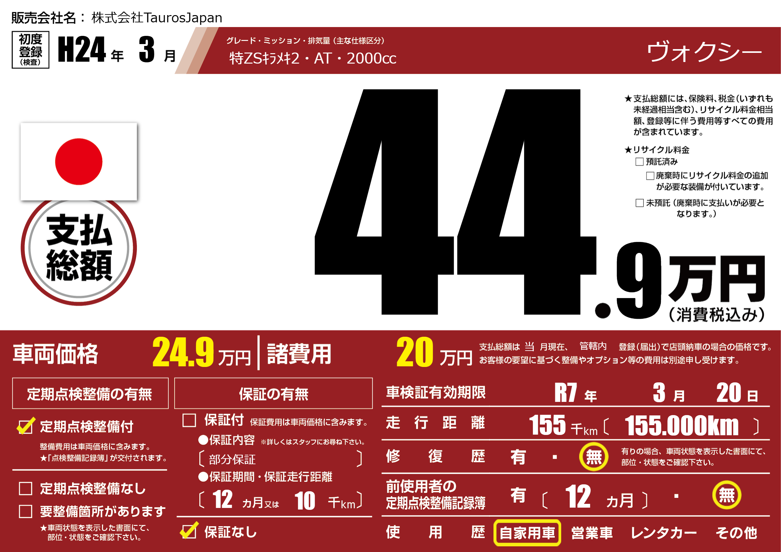 | 走行キロ | 15.5万km | 初年度登録 | H24年3月 |