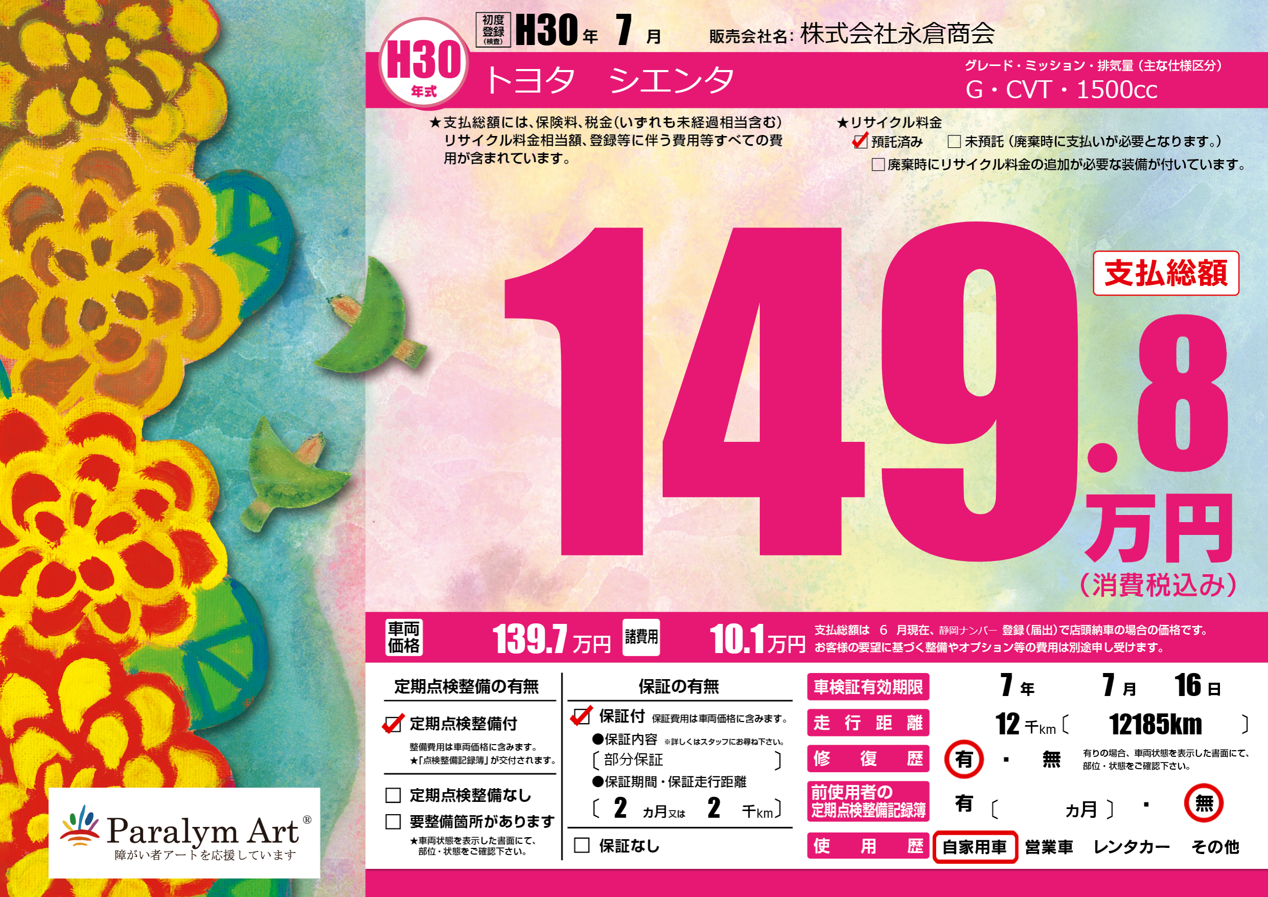 | 車名 | トヨタ シエンタ | グレード ミッション 排気量 |