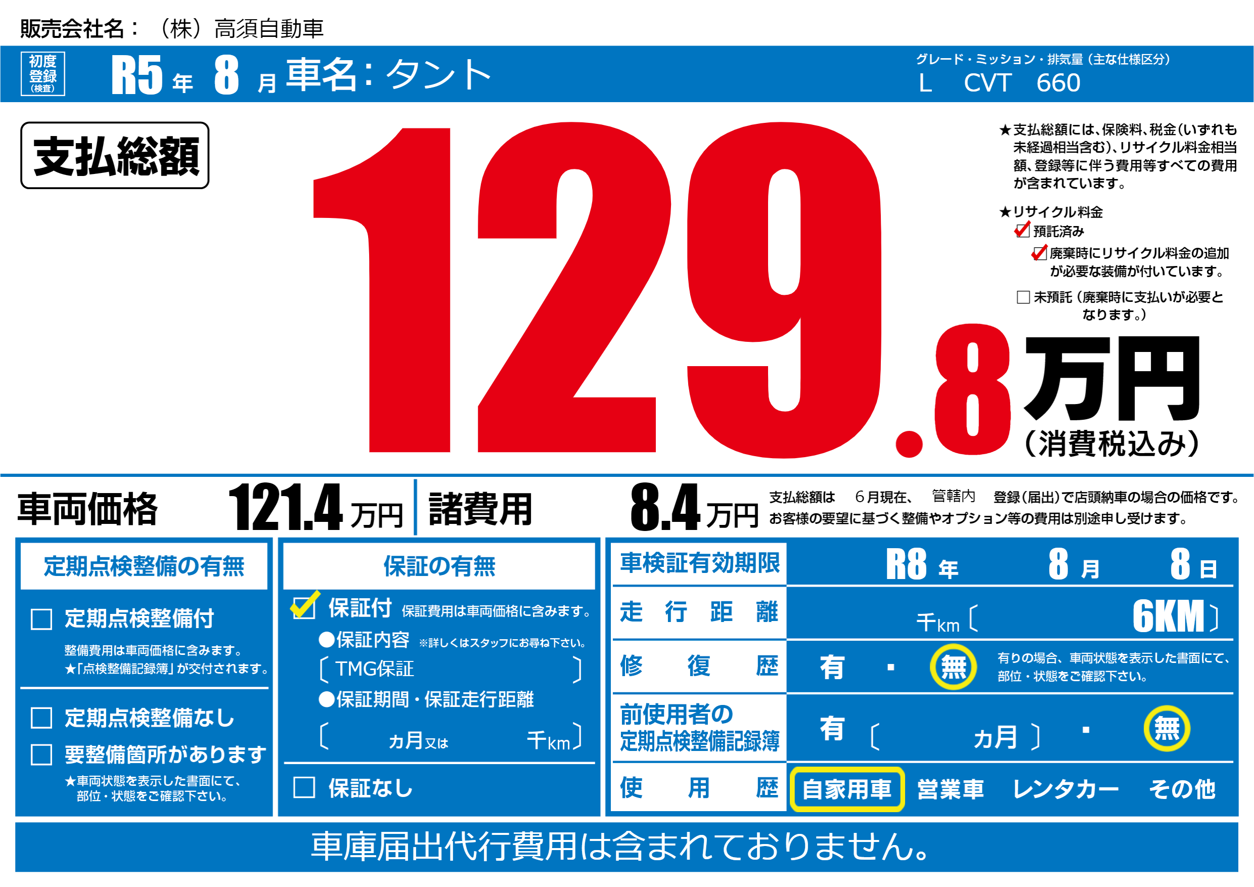 | 走行キロ | - | 初年度登録 | R5年8月 |