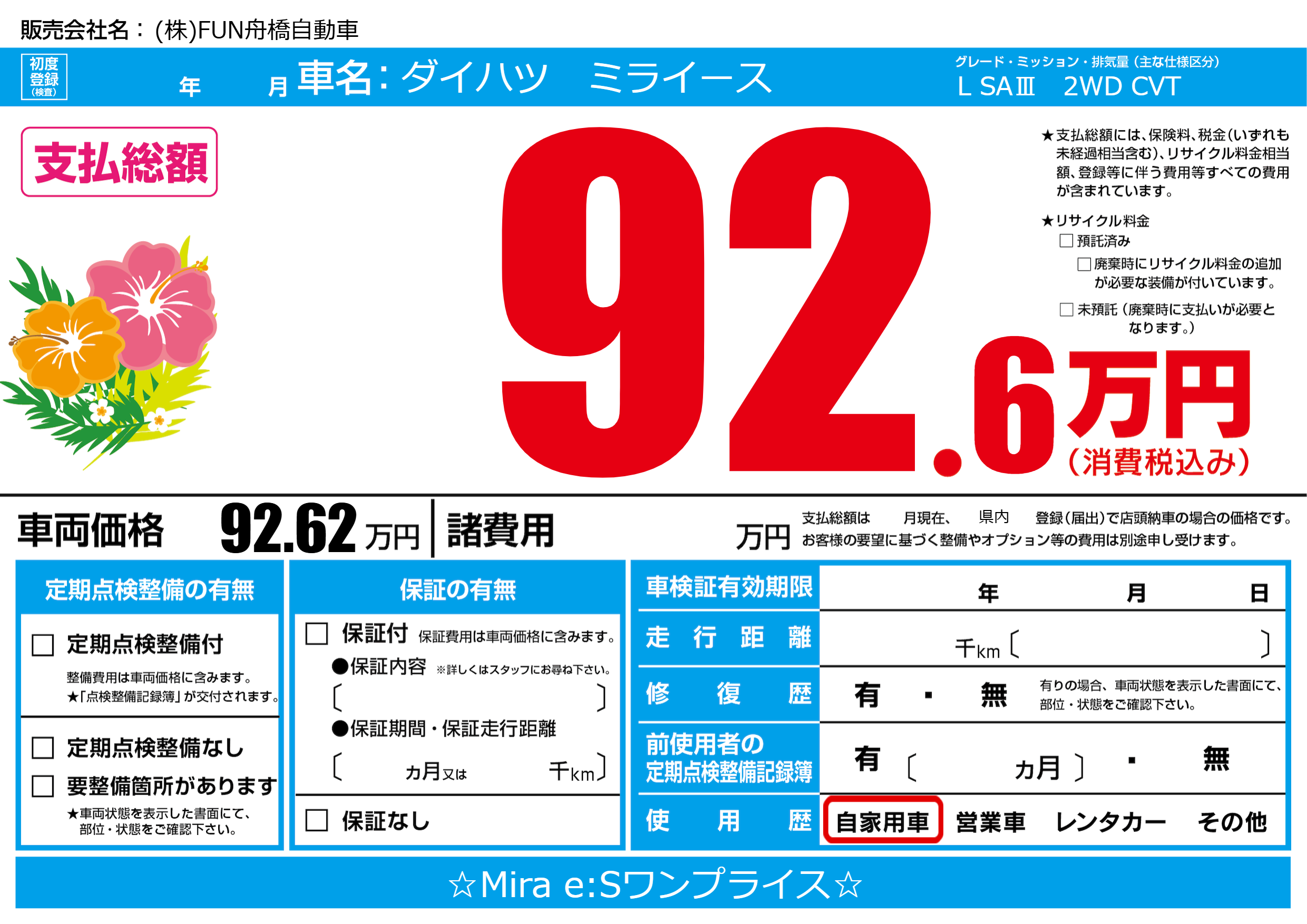 | 車名 | ダイハツ ミライース | グレード ミッション 排気量 |