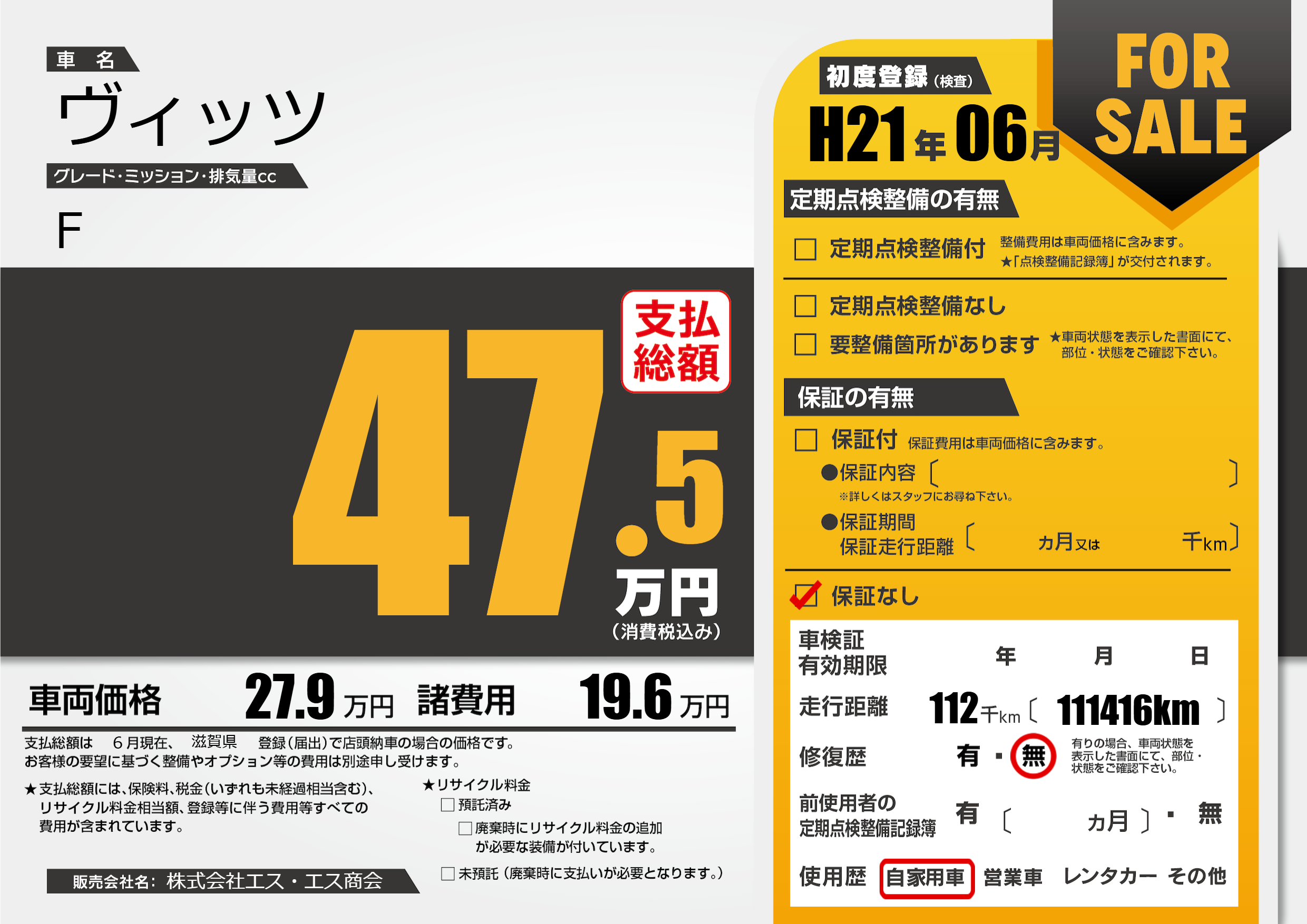 | 車名 | ヴィッツ | グレード ミッション 排気量 |