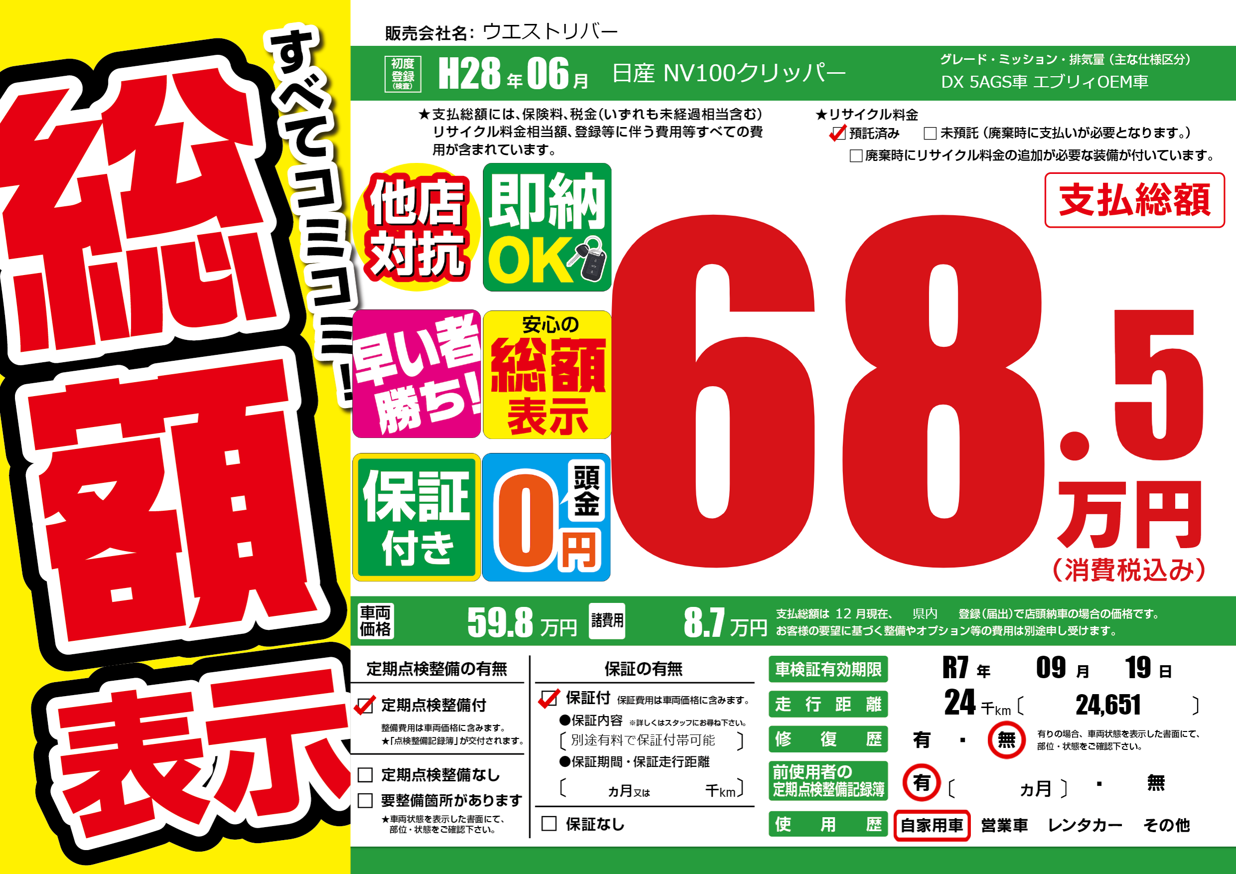 | 車名 | 日産 NV100クリッパー | グレード ミッション 排気量 |
