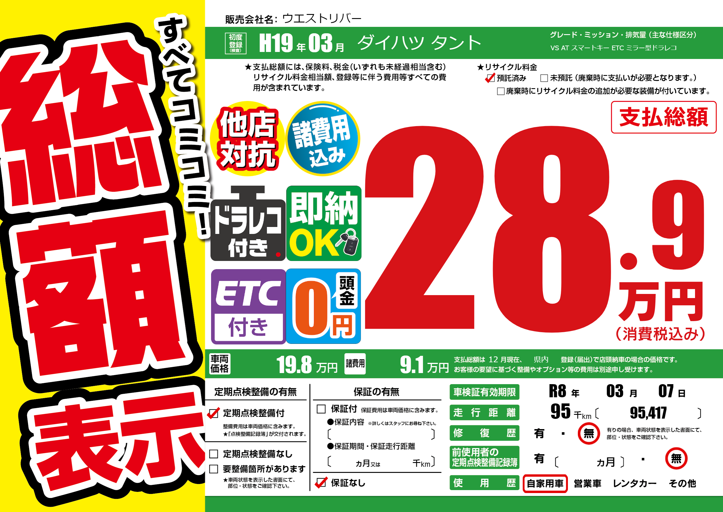 | 車名 | ダイハツ タント | グレード ミッション 排気量 |