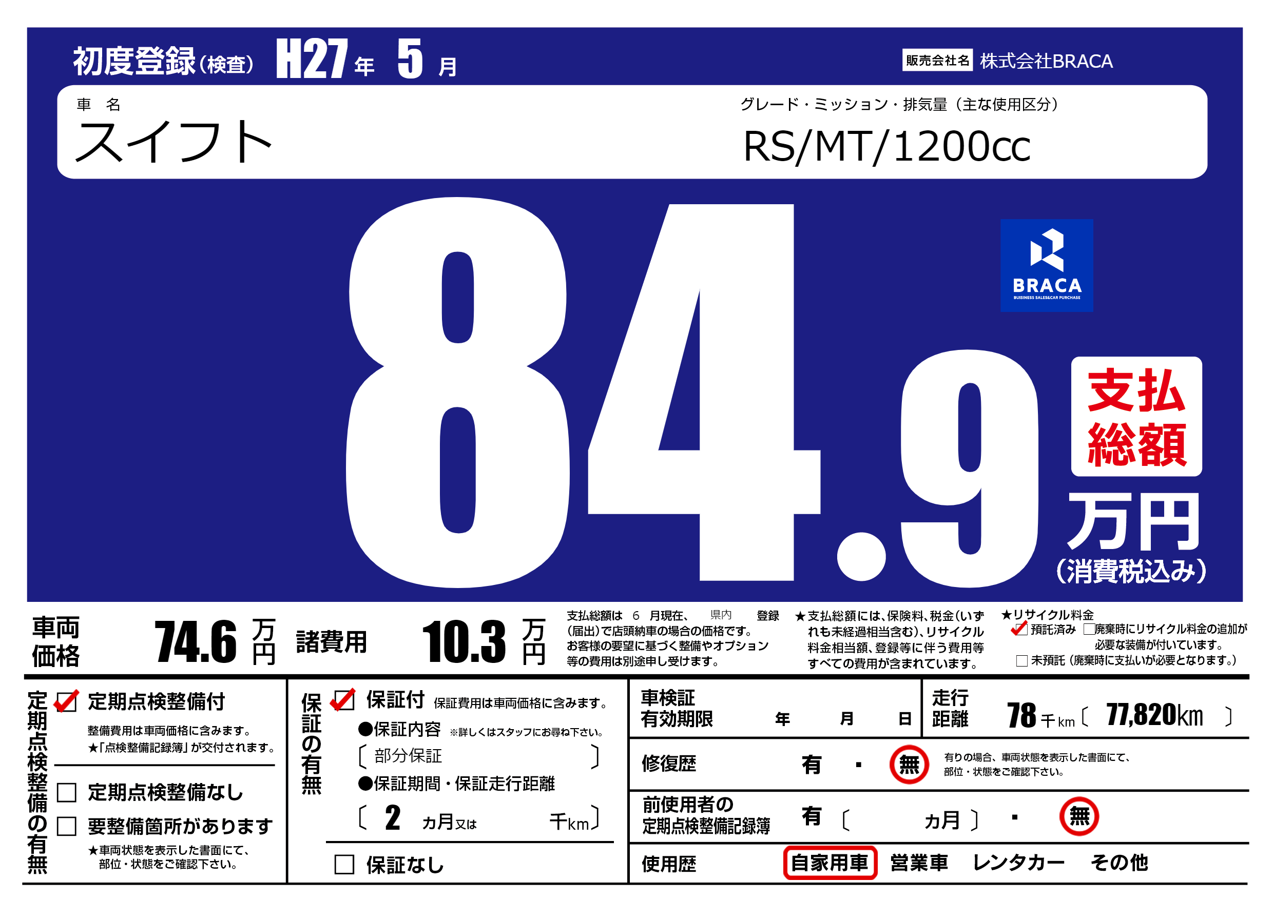 | 走行キロ | 7.8万km | 初年度登録 | H27年5月 |