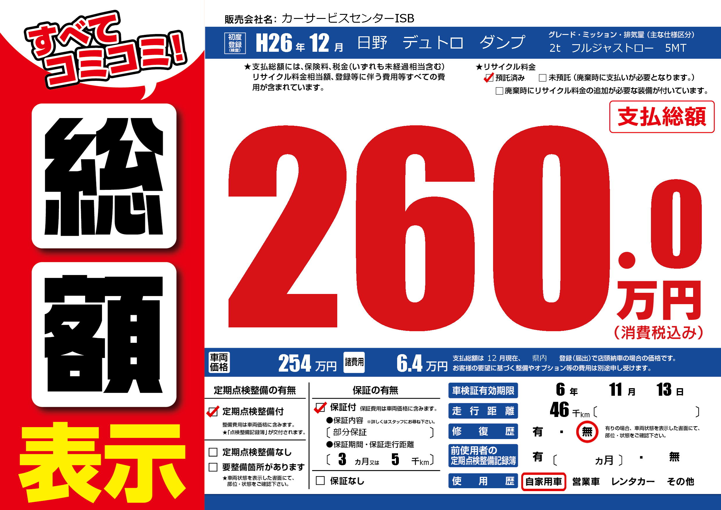 | 走行キロ | 4.6万km | 初年度登録 | H26年12月 |