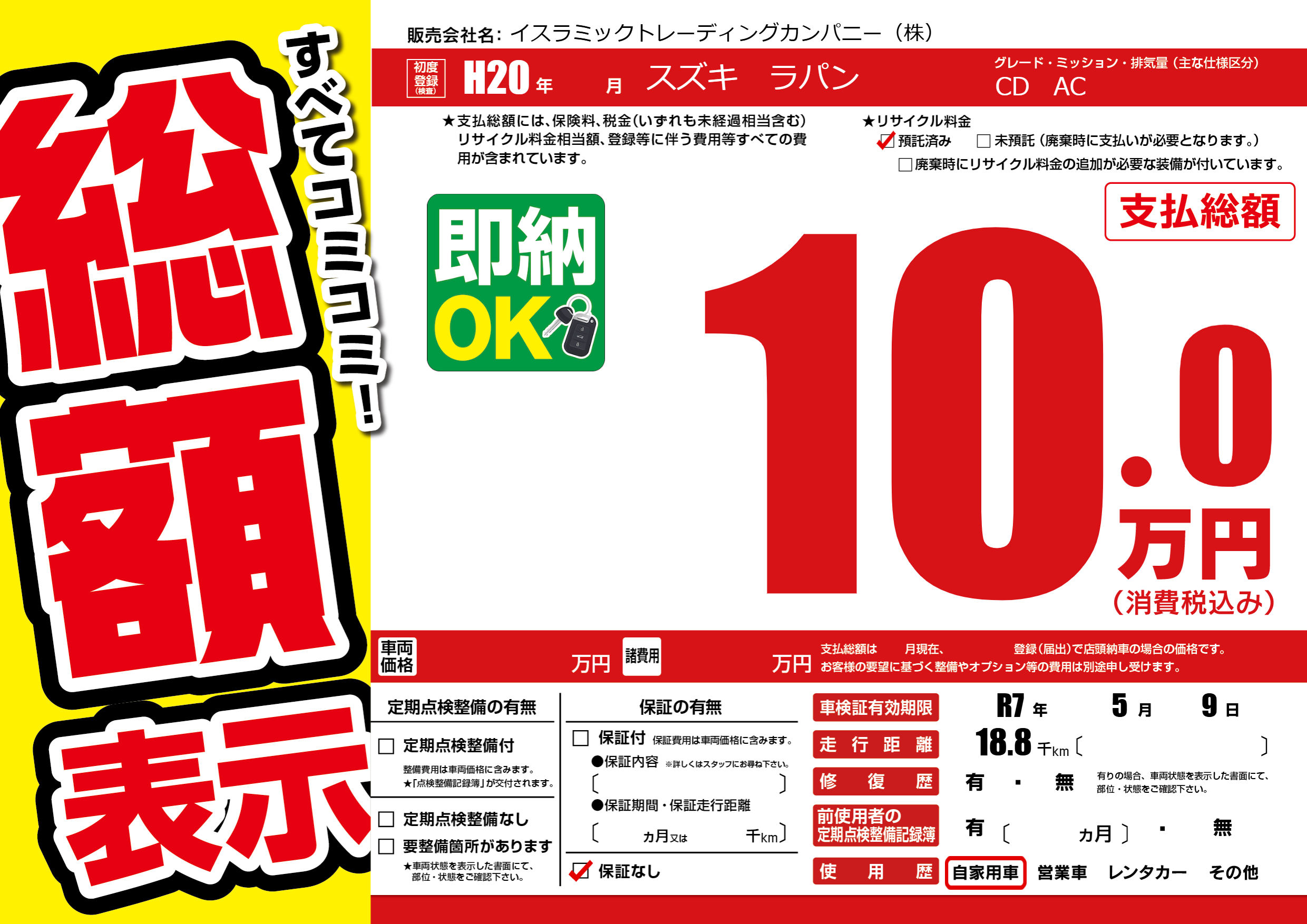 | 車名 | スズキ ラパン | グレード ミッション 排気量 |