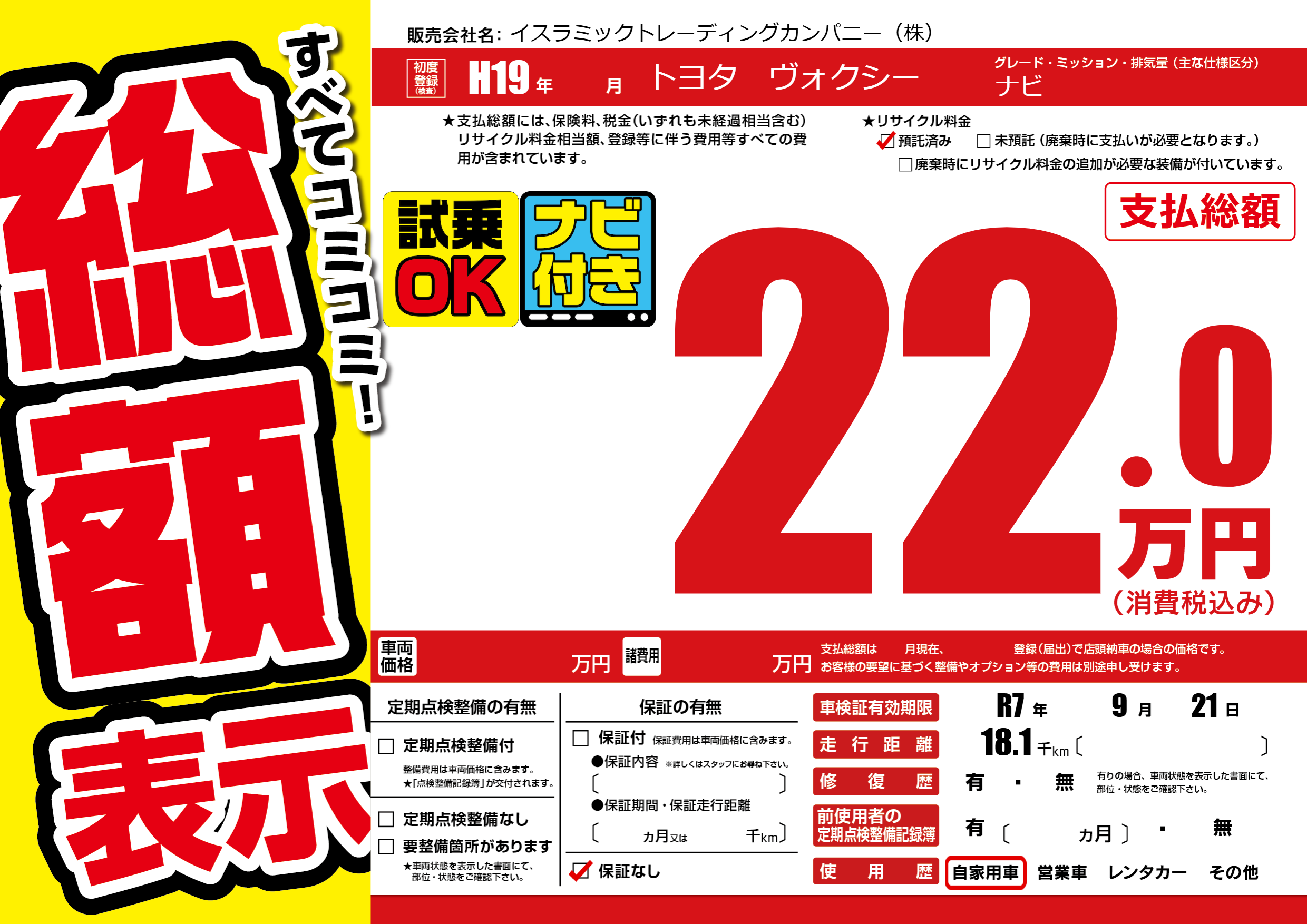 | 車名 | トヨタ ヴォクシー | グレード ミッション 排気量 |