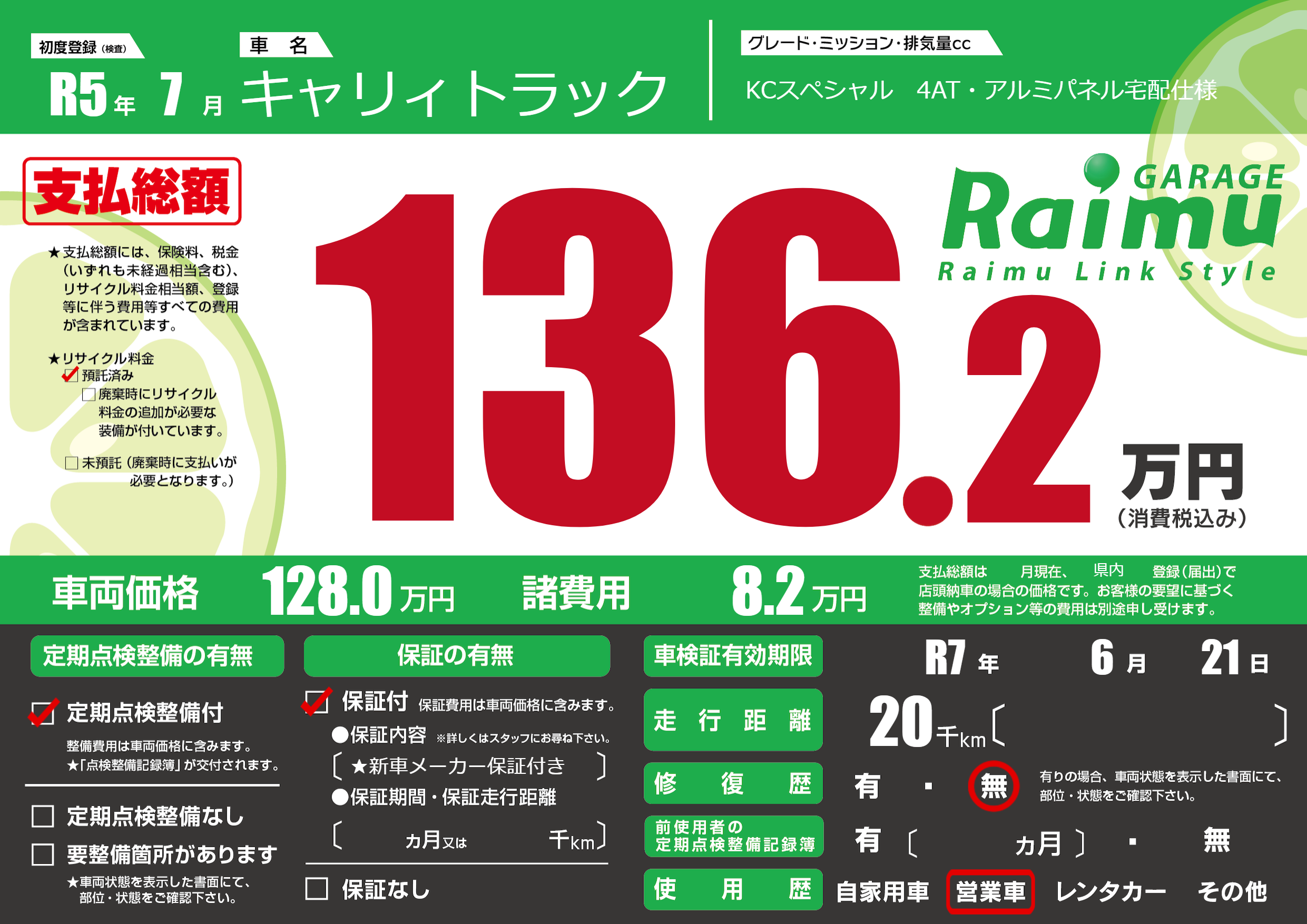| 走行キロ | 2万km | 初年度登録 | R5年7月 |