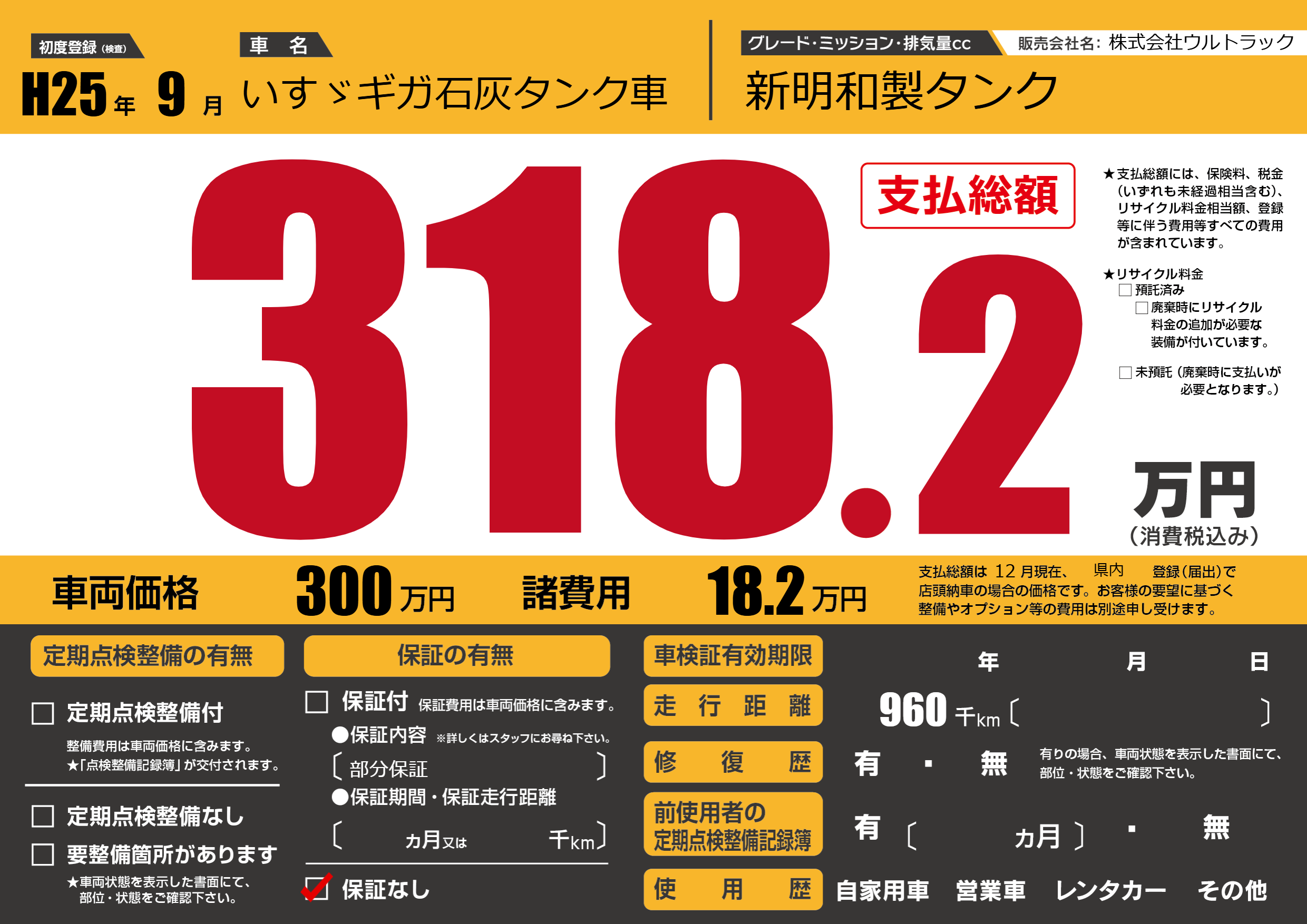 | 車名 | いすゞギガ石灰タンク車 | グレード ミッション 排気量 |