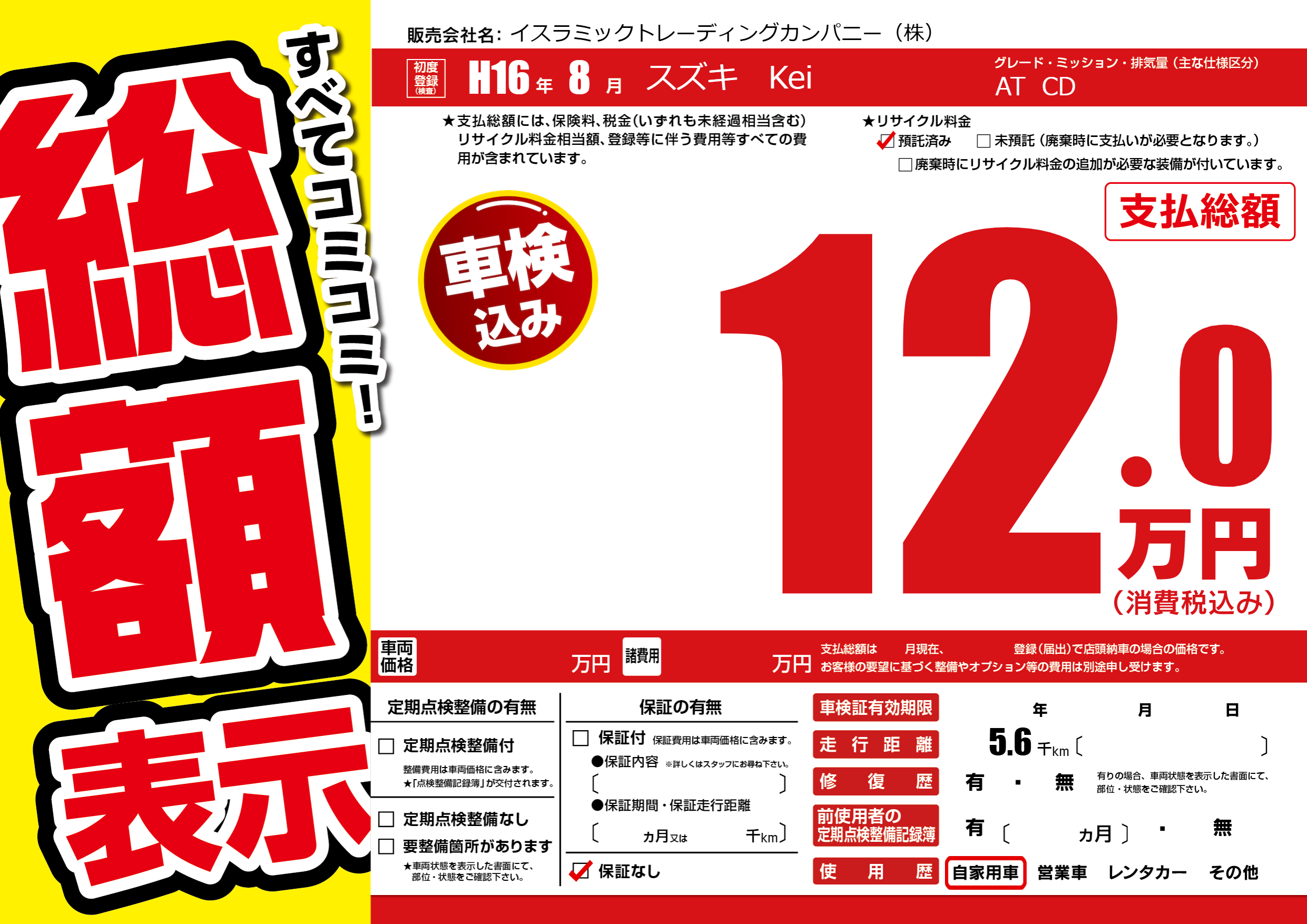 | 車名 | スズキ Kei | グレード ミッション 排気量 |