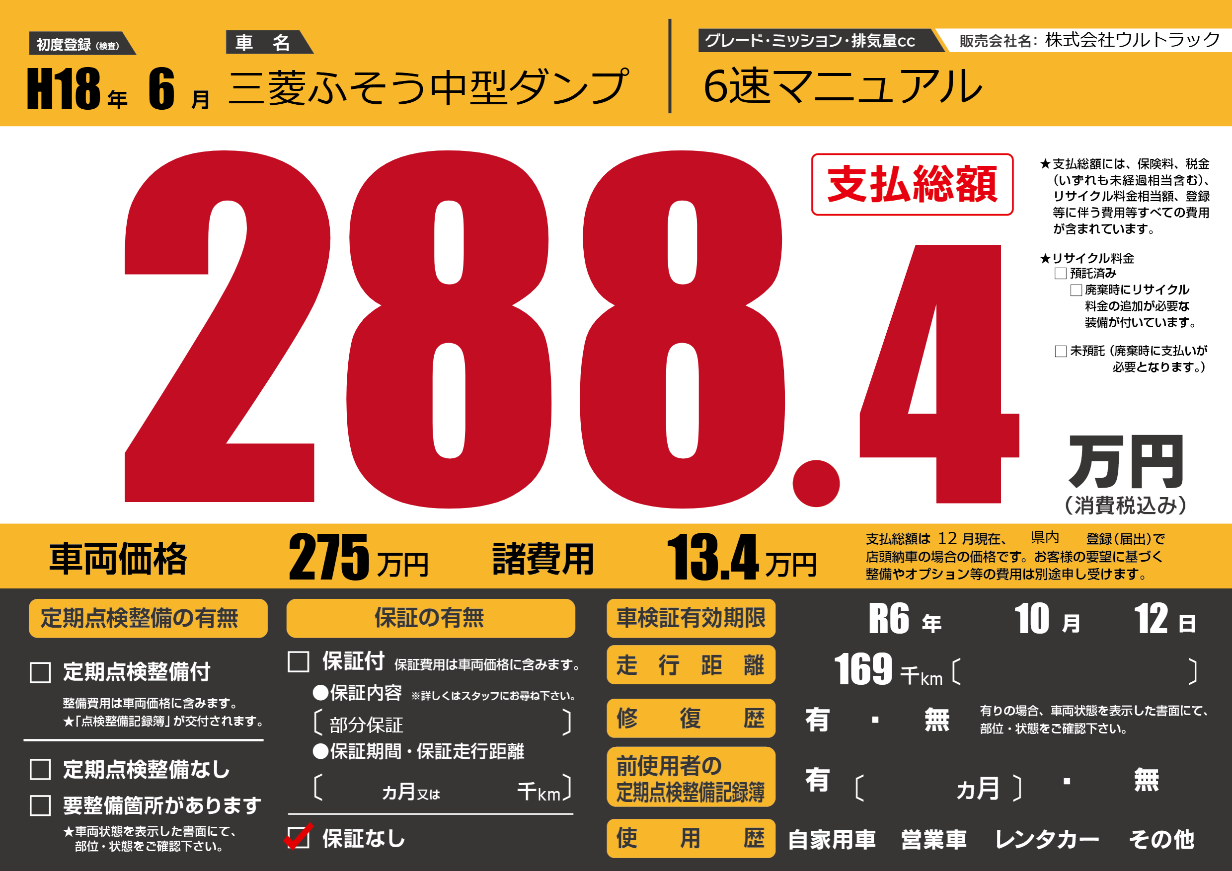 | 車名 | 三菱ふそう中型ダンプ | グレード ミッション 排気量 |