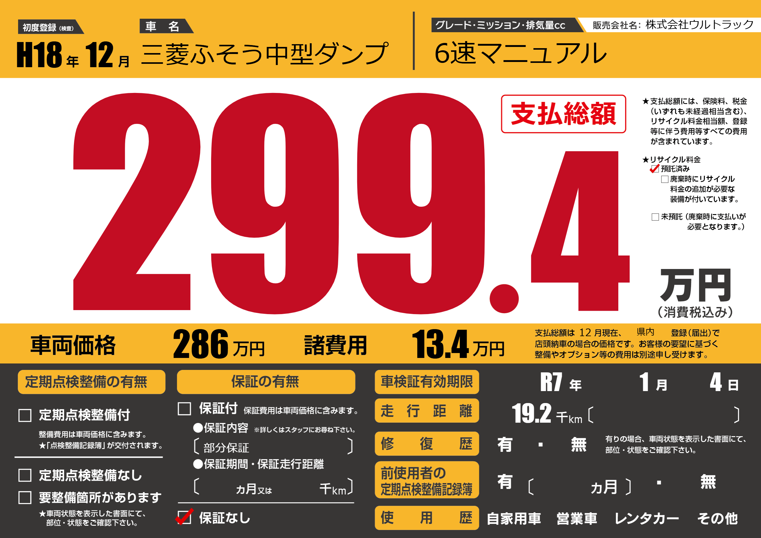 | 車名 | 三菱ふそう中型ダンプ | グレード ミッション 排気量 |