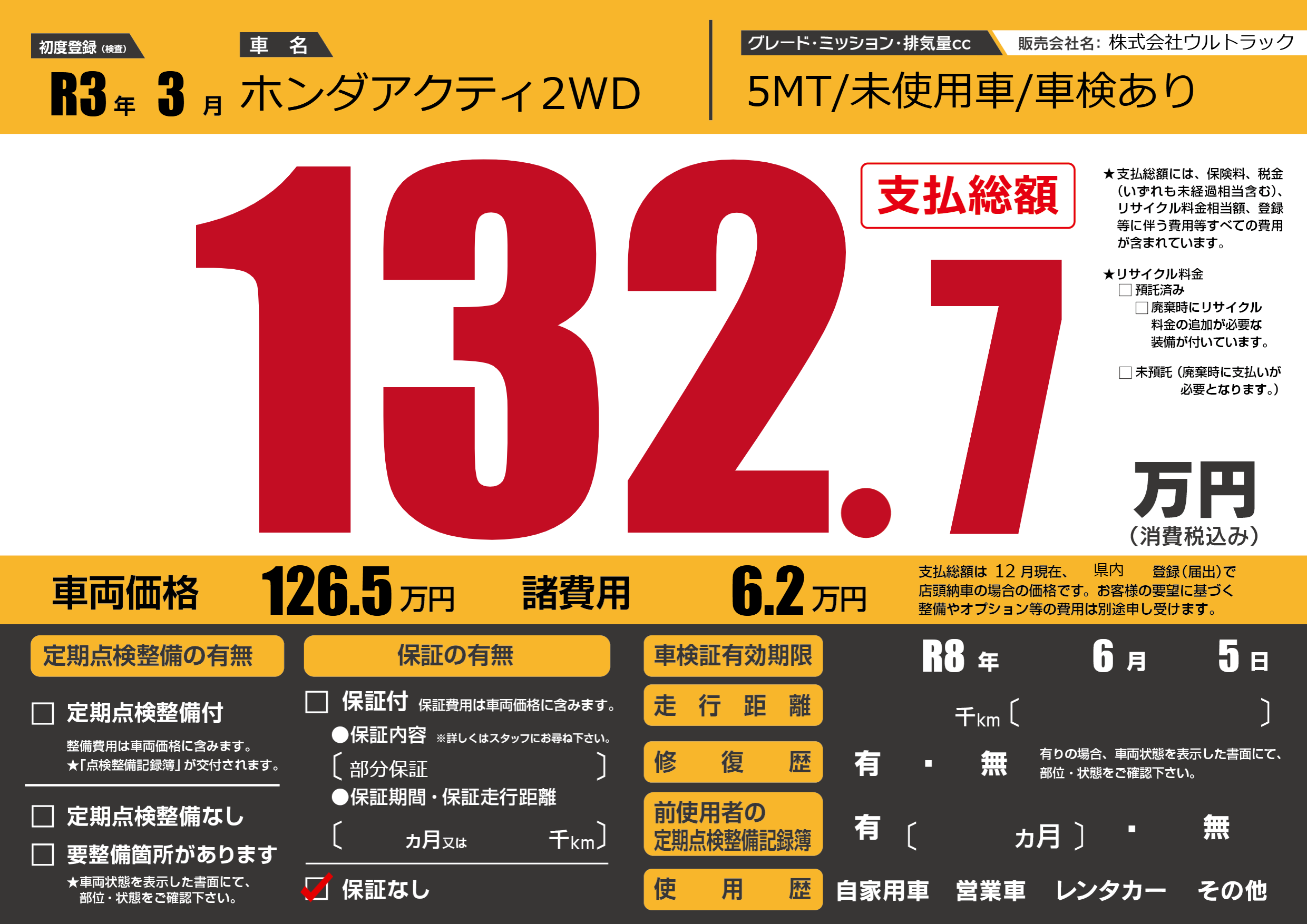 | 車名 | ホンダアクティ2WD | グレード ミッション 排気量 |