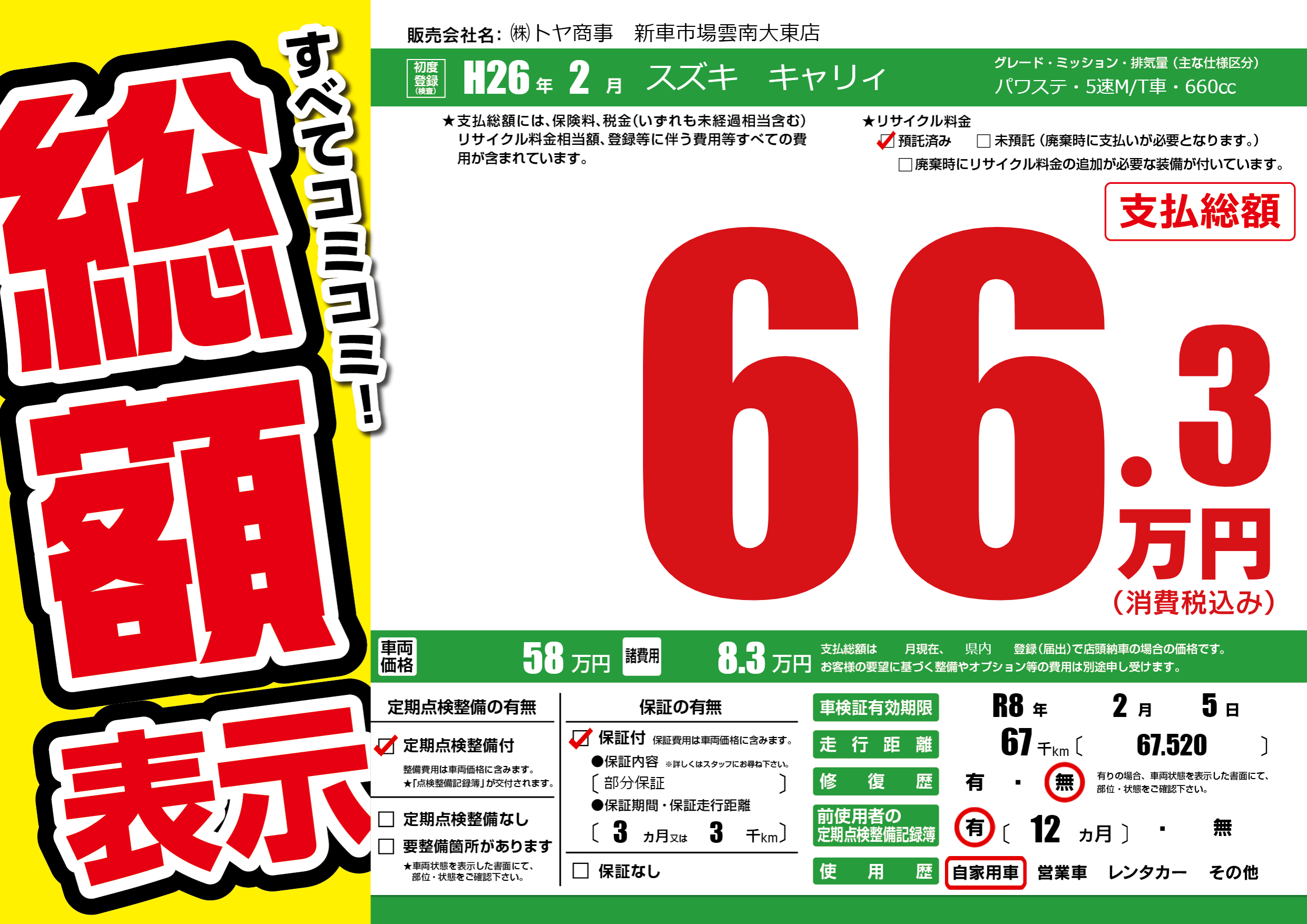 | 車名 | スズキ キャリィ | グレード ミッション 排気量 |