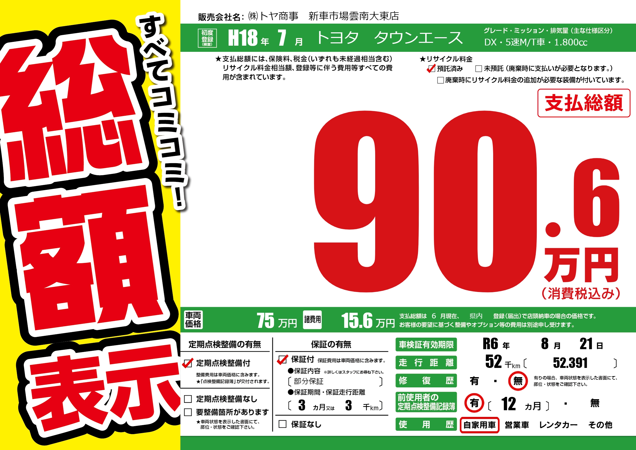 | 車名 | トヨタ タウンエース | グレード ミッション 排気量 |