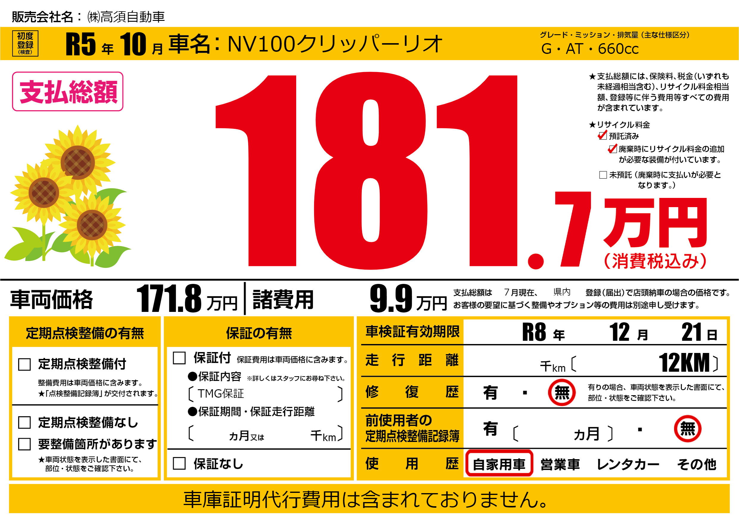 | 車名 | NV100クリッパーリオ | グレード ミッション 排気量 |