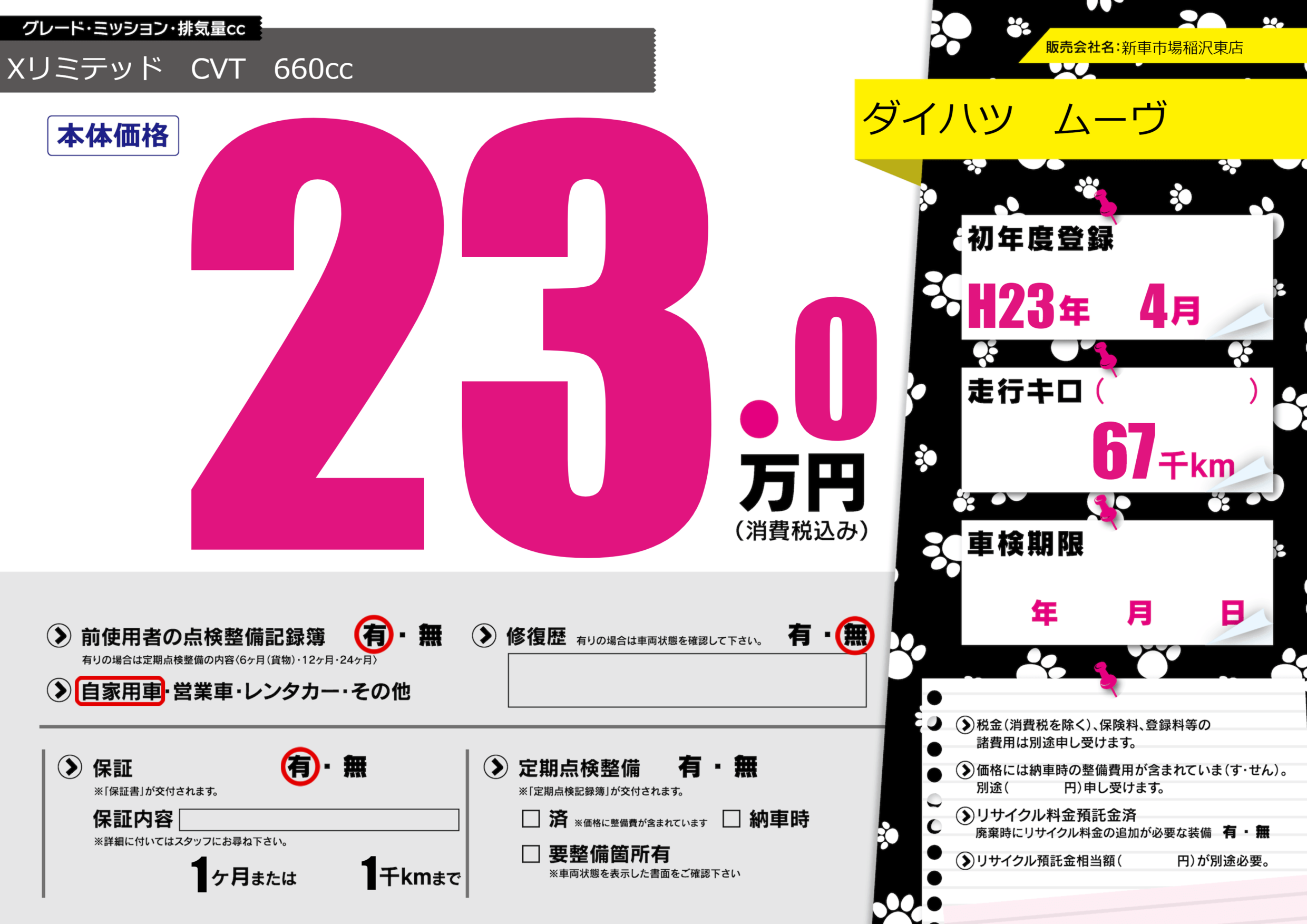 | 走行キロ | 6.7万km | 初年度登録 | H23年4月 |