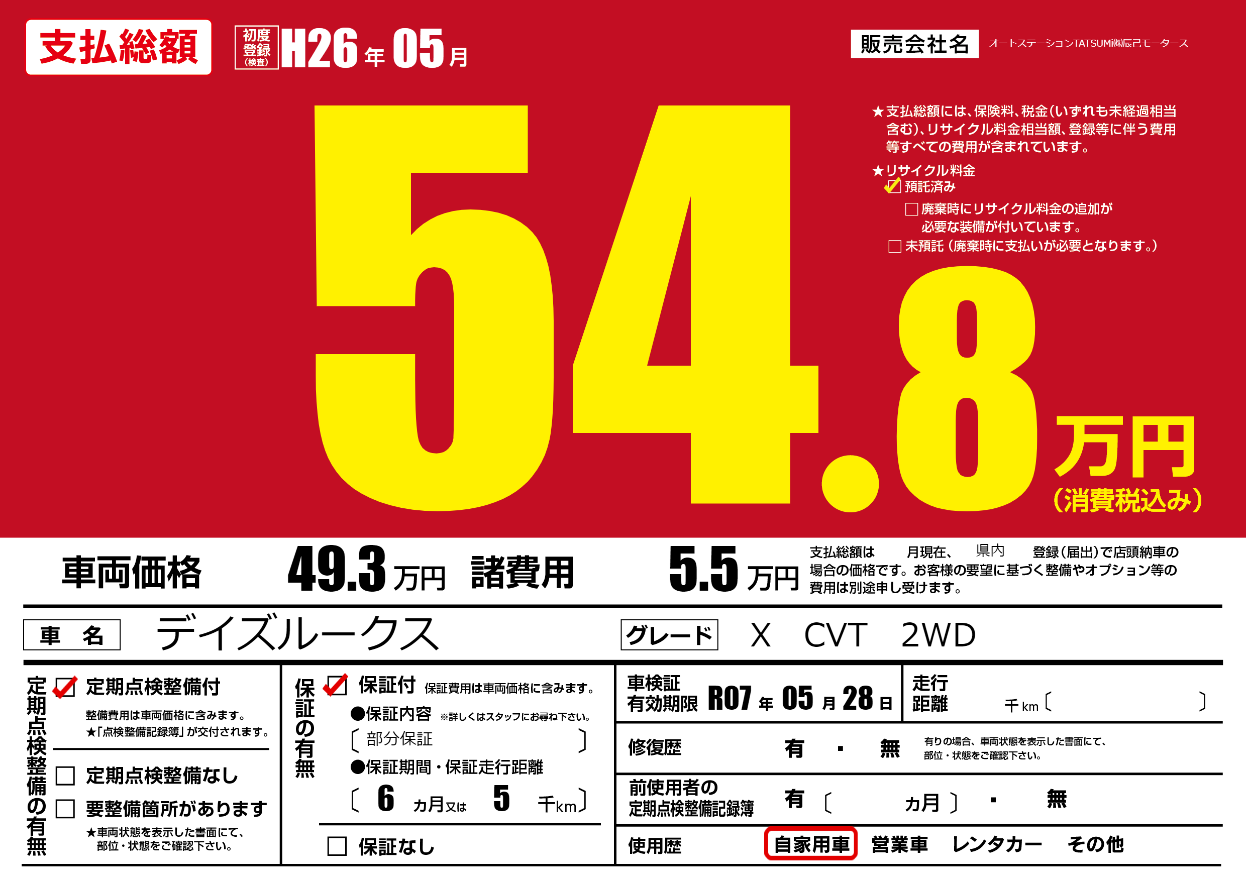 | 走行キロ | - | 初年度登録 | H26年05月 |