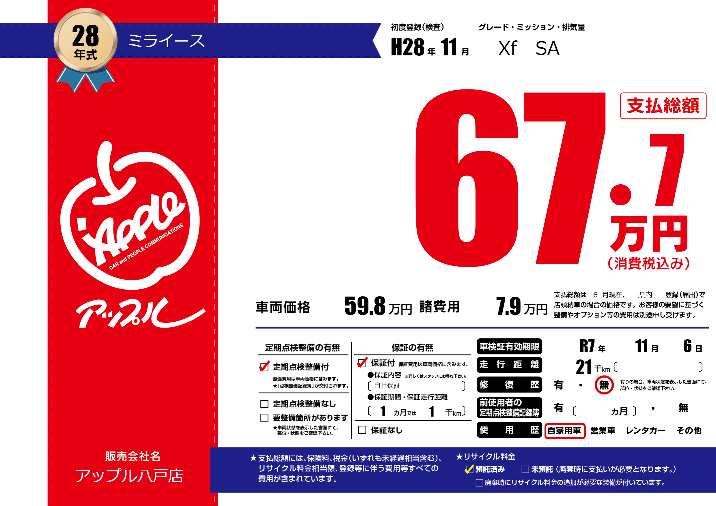 | 車検制限 | R7年 11月 6日 | ||
