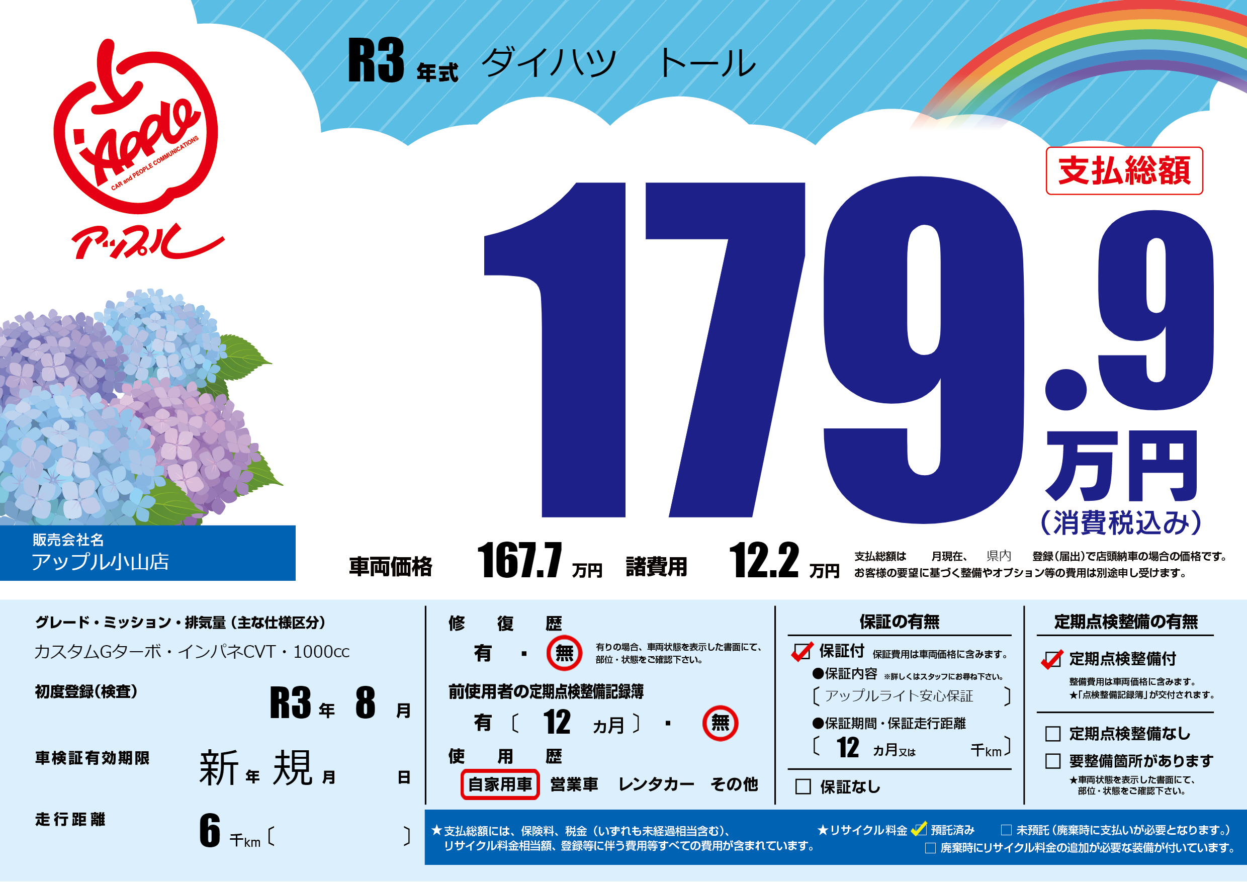 | 走行キロ | 0.6万km | 初年度登録 | R3年8月 |