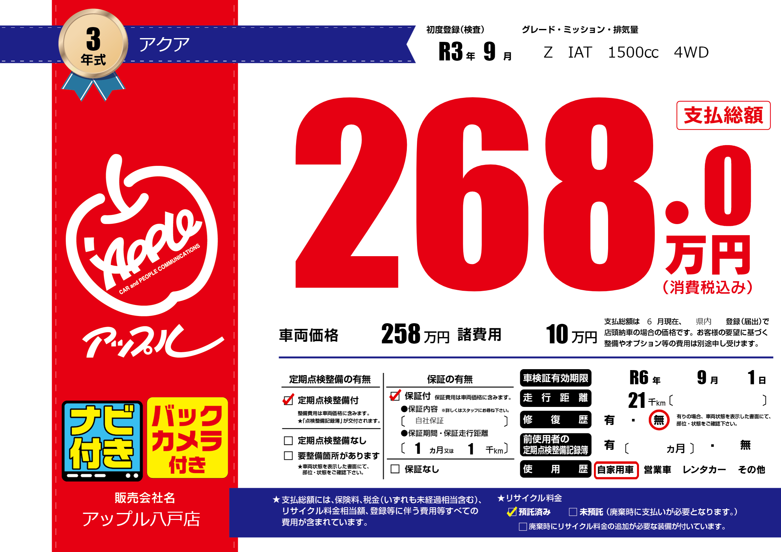 なし | 車検制限 | R6年9月1月 |