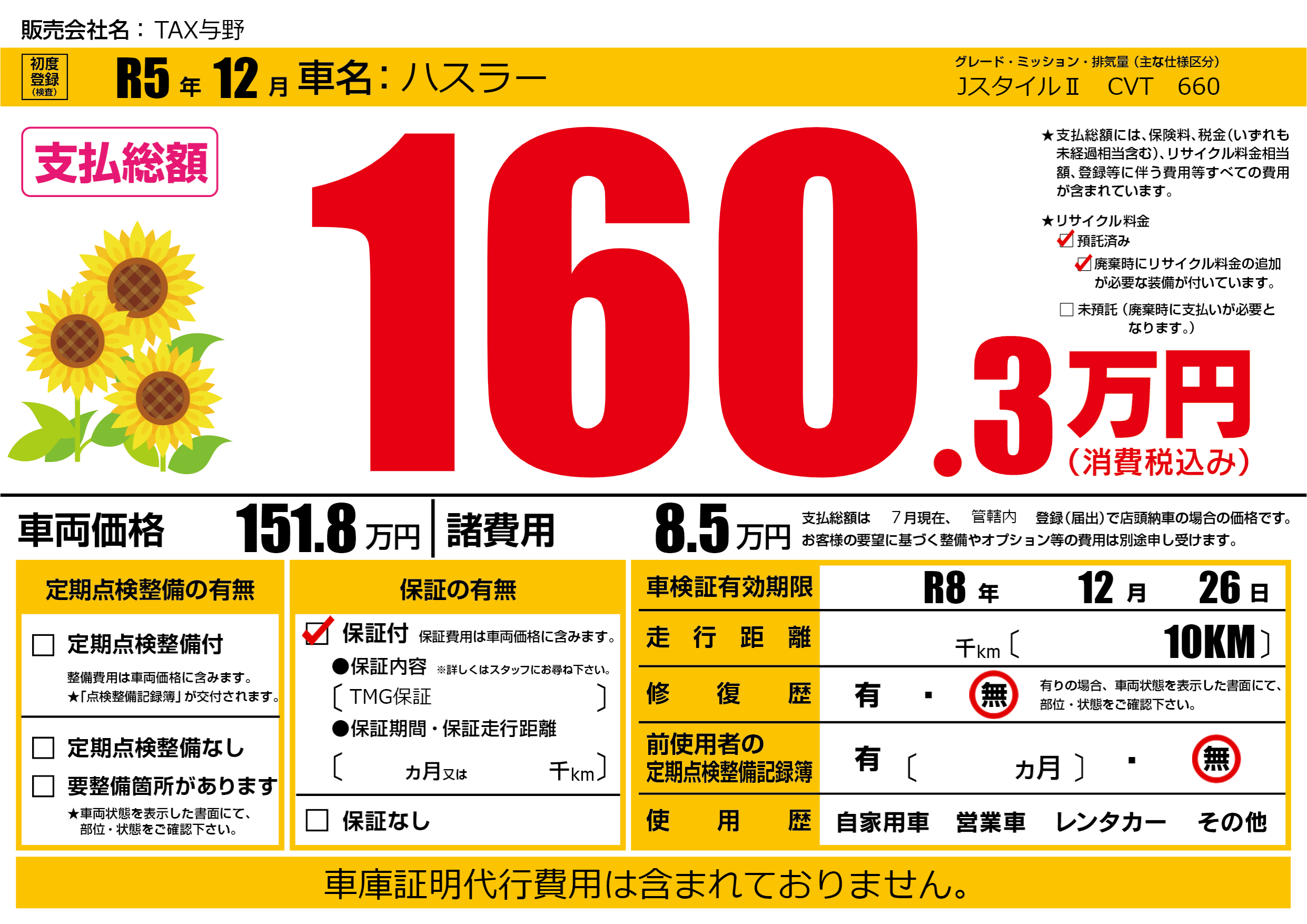 保証付き 保証内容(TMG保証) ---ヶ月または()千kmまで |