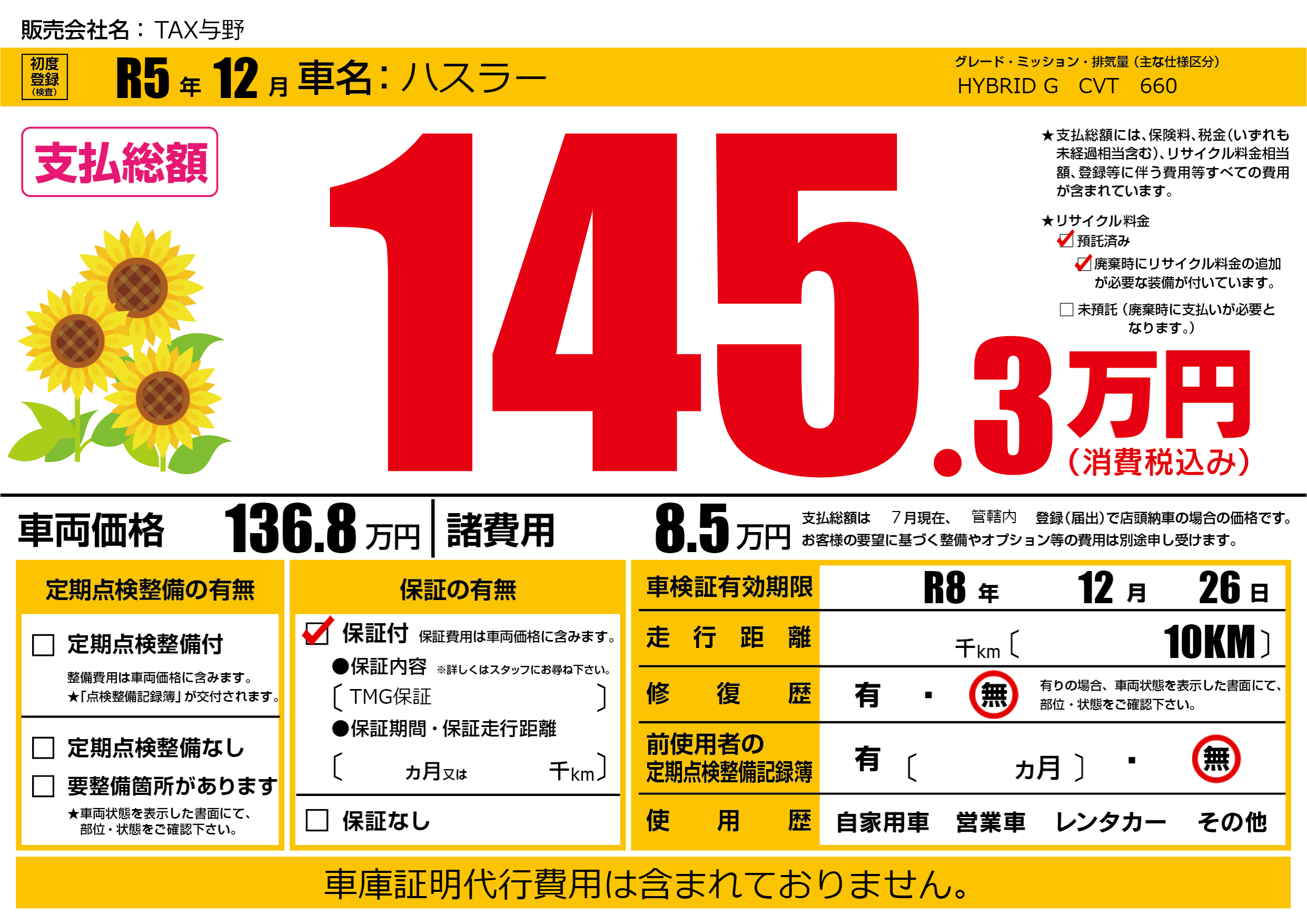 | 車名 | ハスラー | グレード ミッション 排気量 |