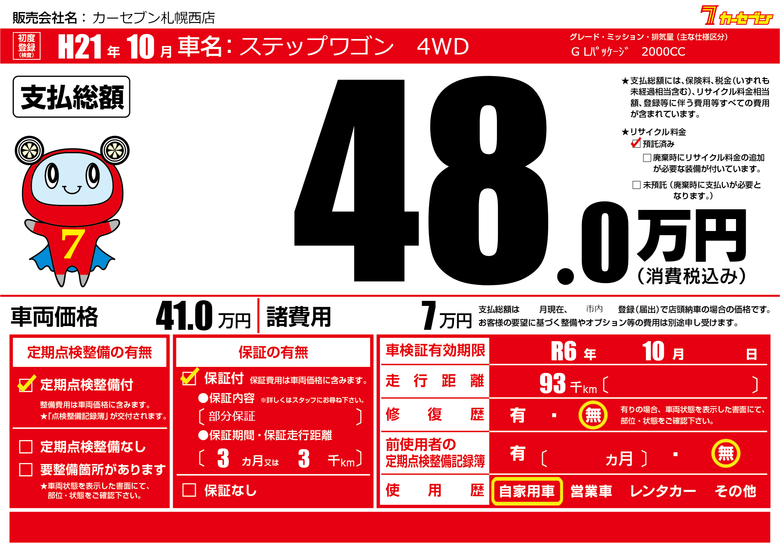 | 走行キロ | 9.3万km | 初年度登録 | H21年10月 |