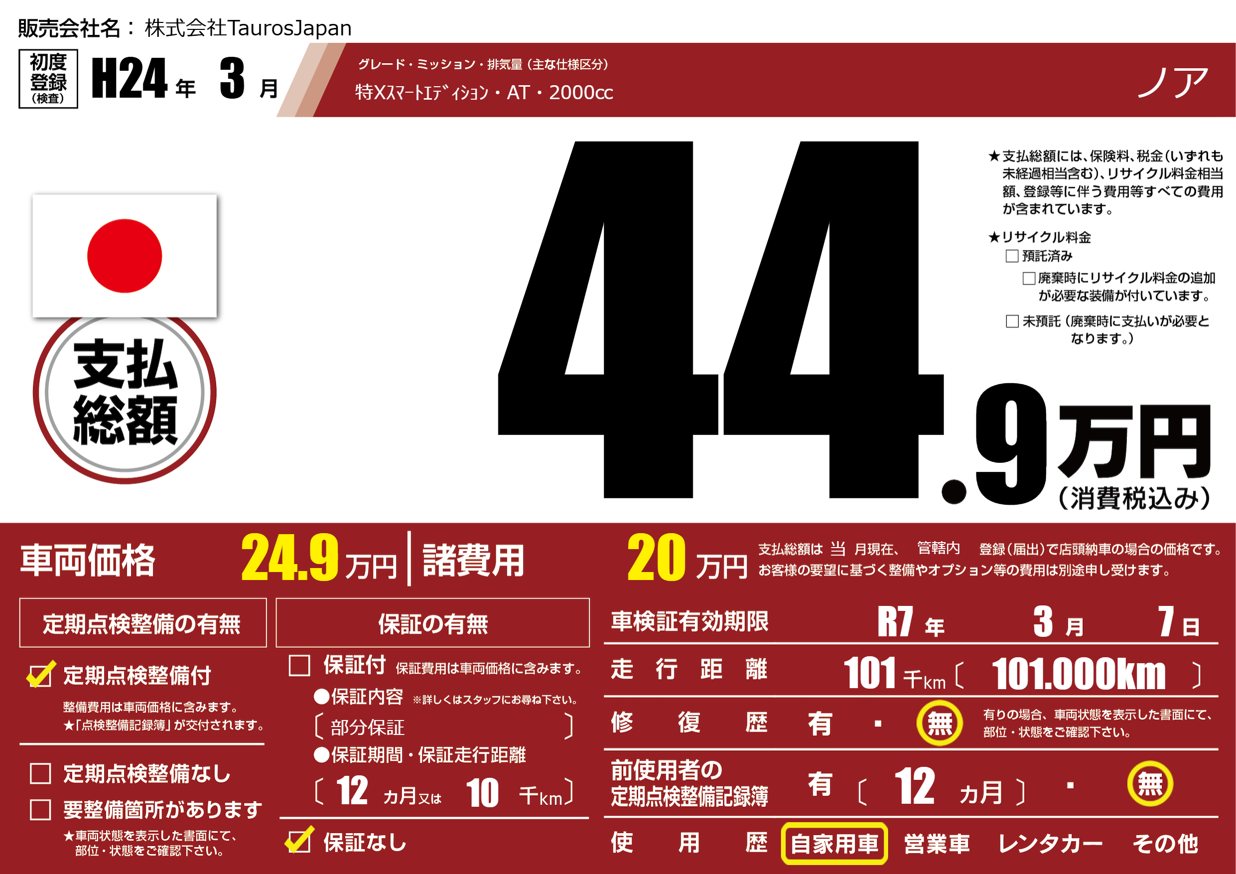 | 走行キロ | 10.1万km | 初年度登録 | H24年3月 |