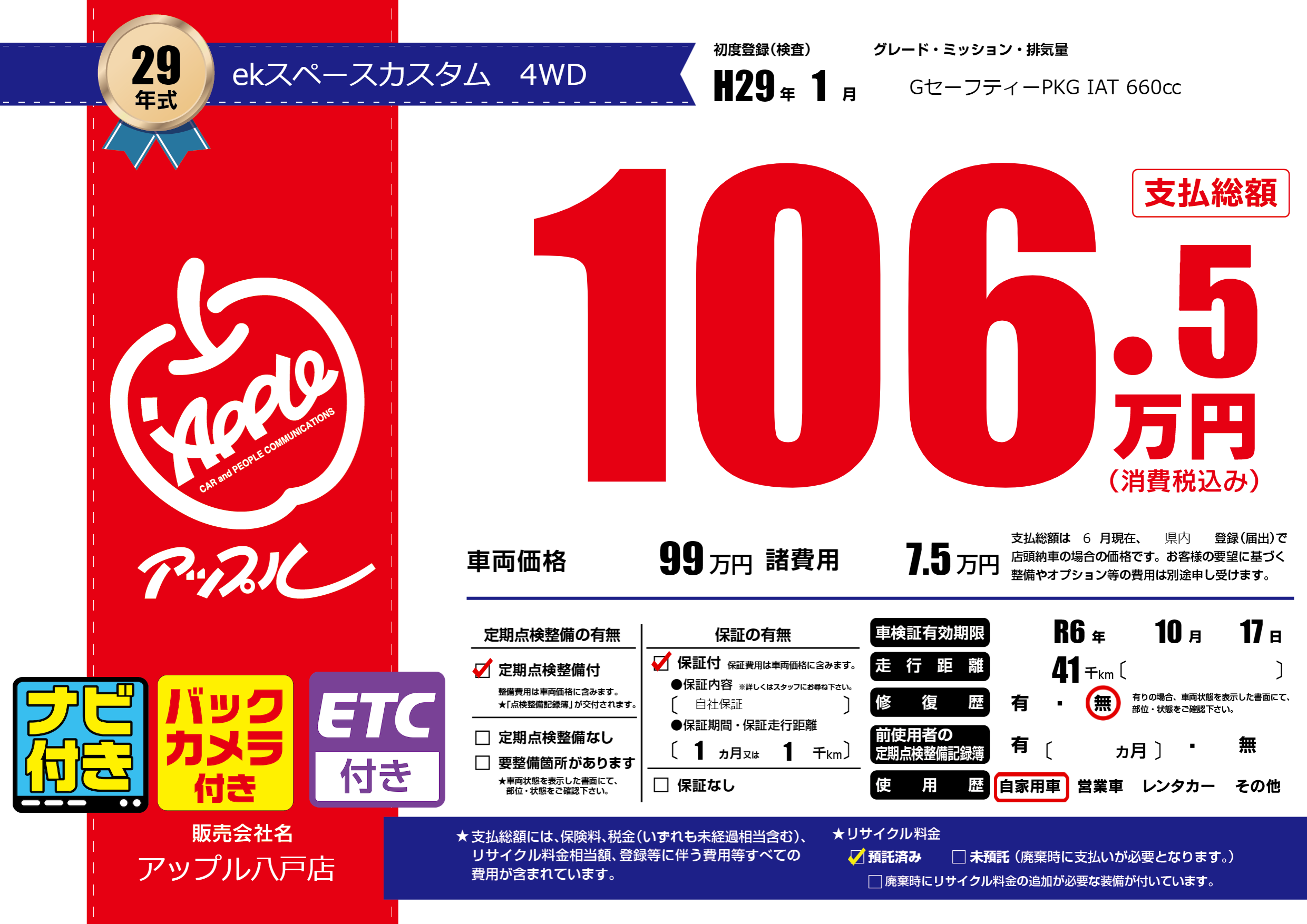なし | 車検制限 | R6年10月17月 |