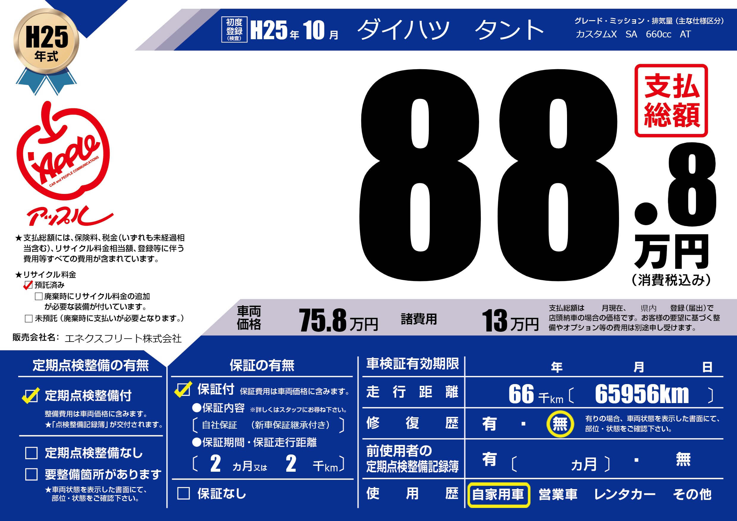 | 車名 | ダイハツ タント | グレード ミッション 排気量 |