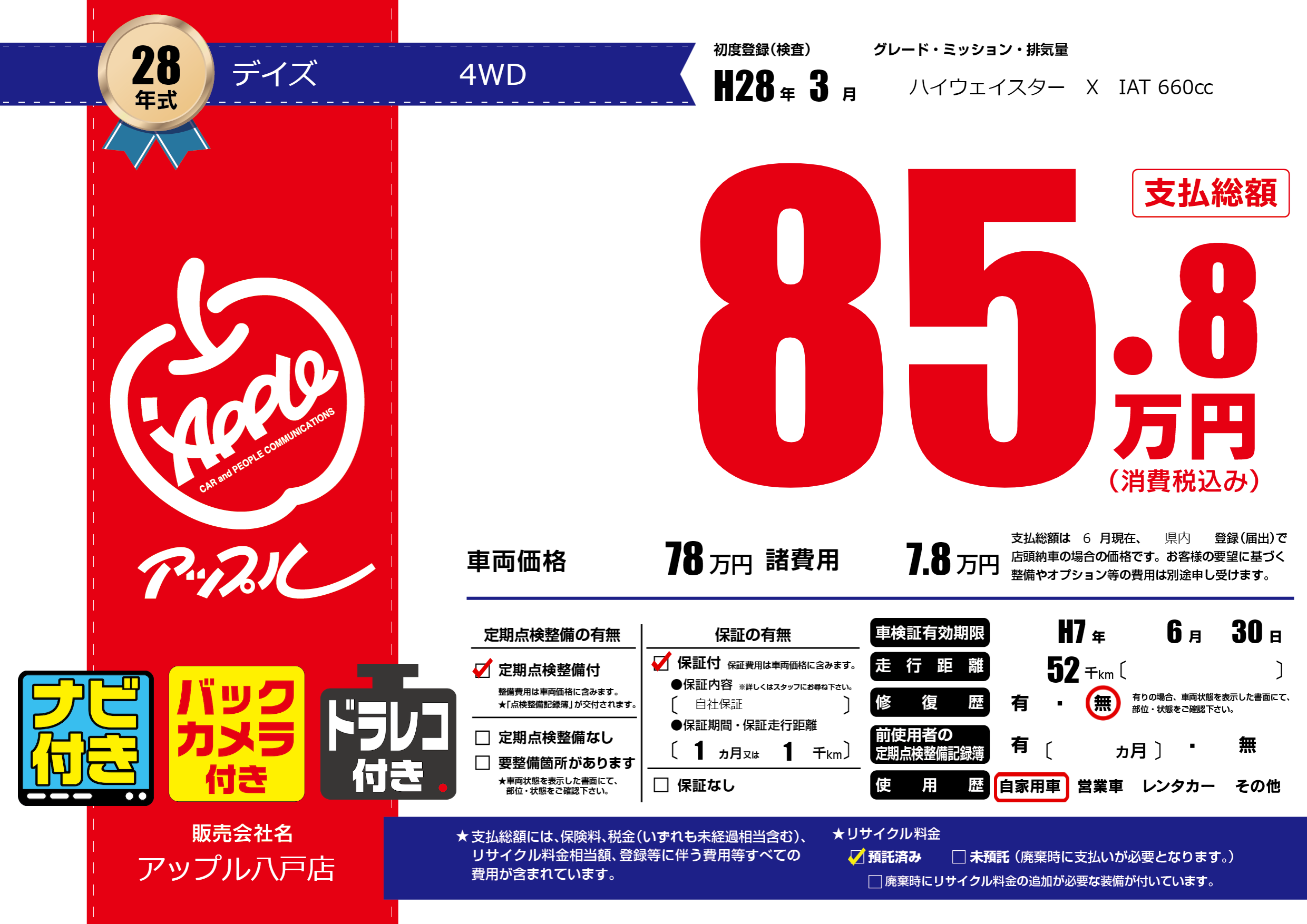 | 走行キロ | 5.2万km | 初年度登録 | H28年3月 |