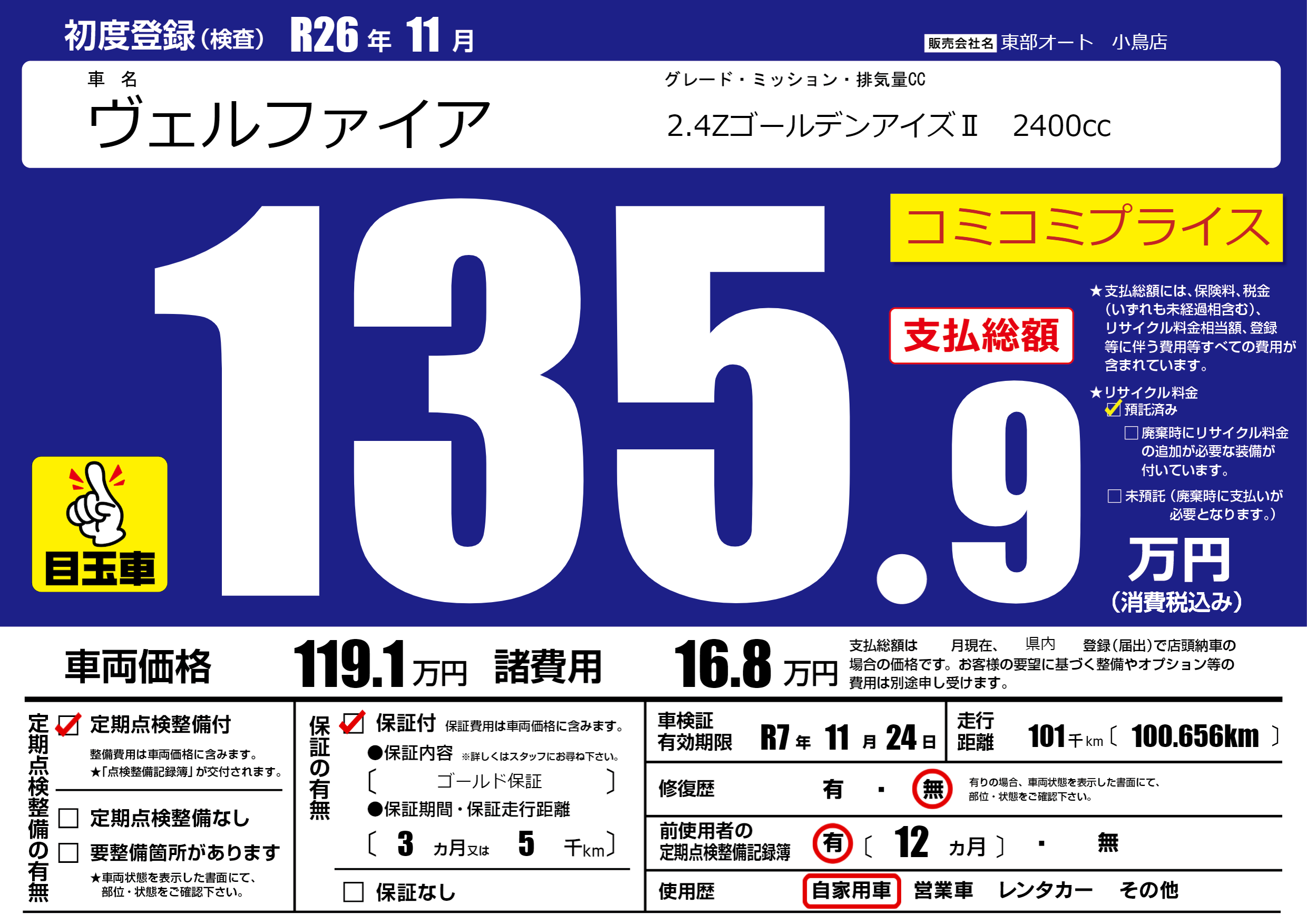 | 車名 | ヴェルファイア | グレード ミッション 排気量 |