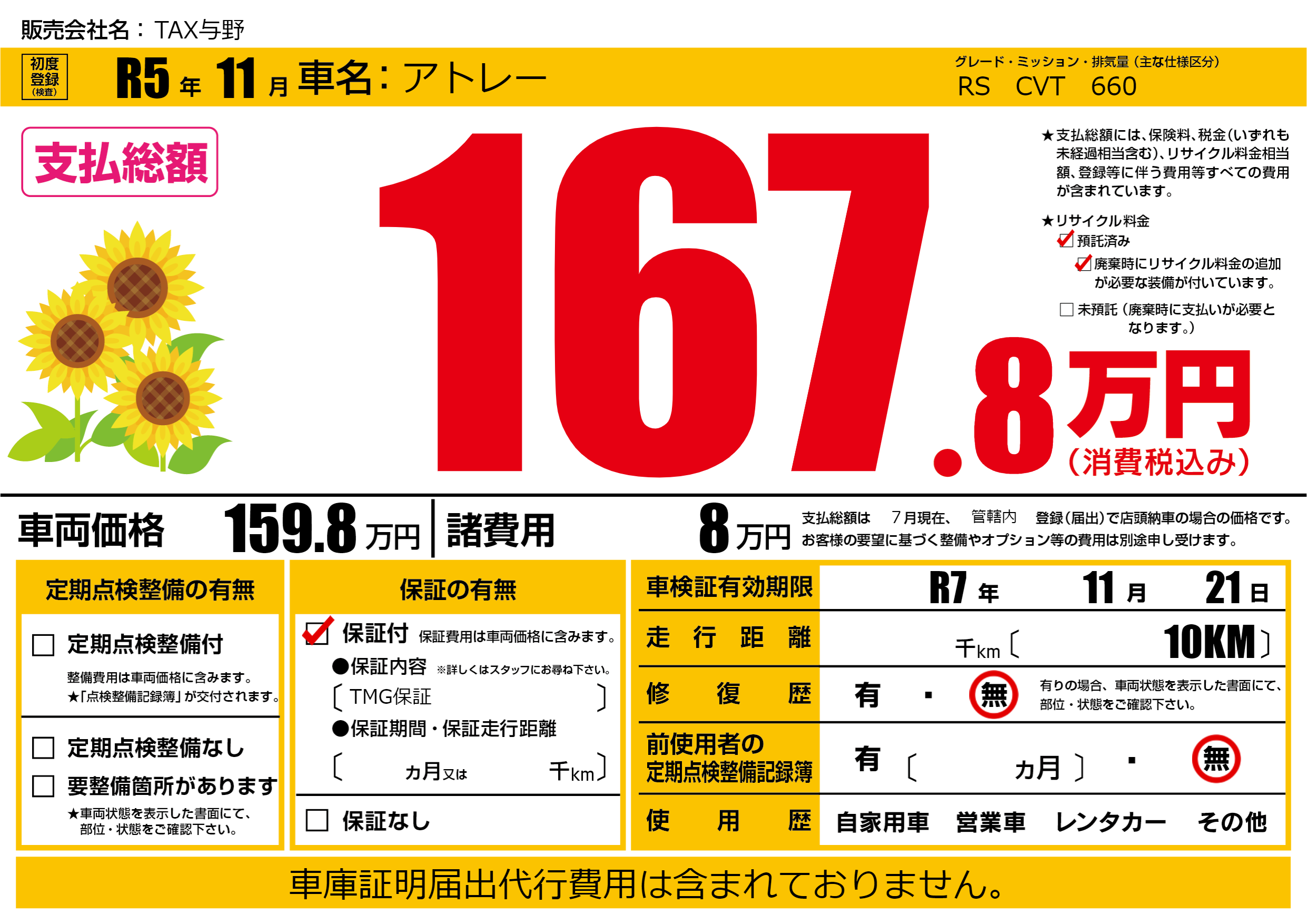 保証付き 保証内容(TMG保証) ---ヶ月または()千kmまで |