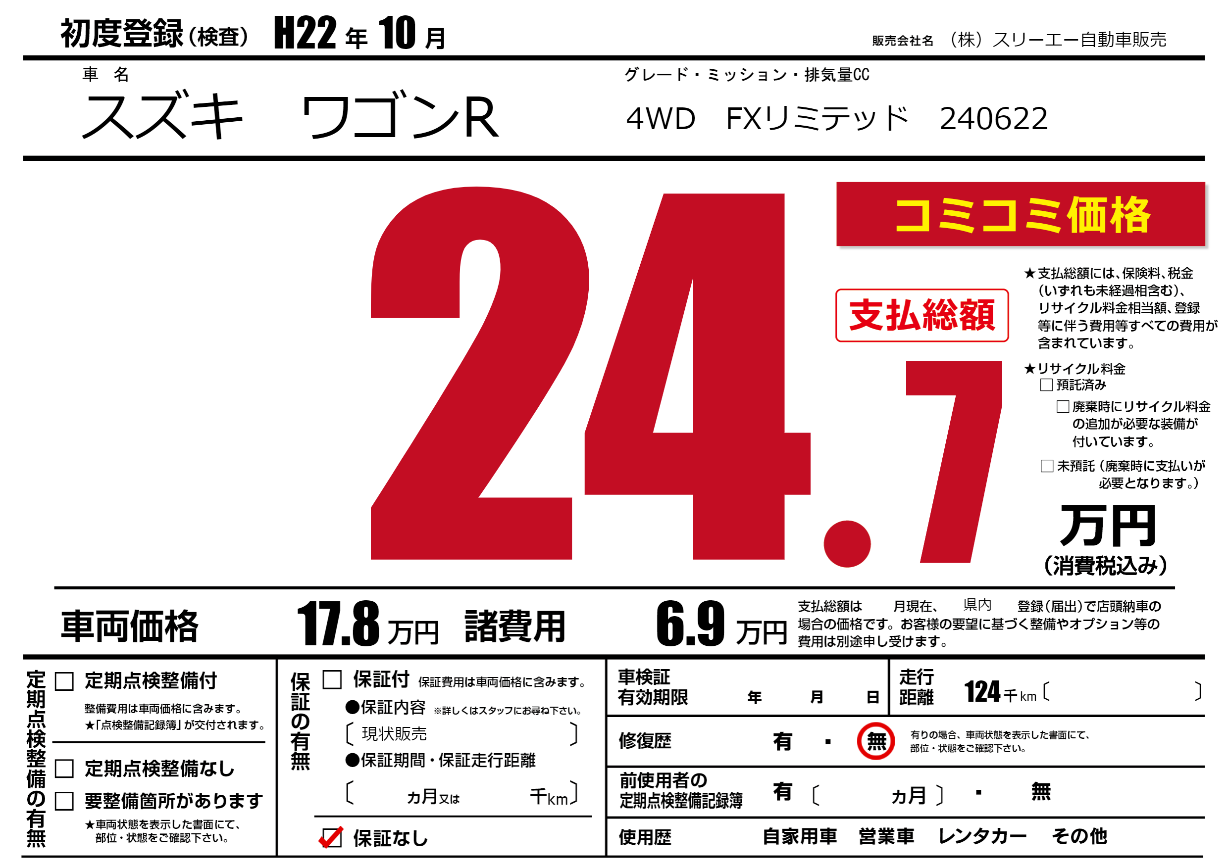 | 車名 | スズキ ワゴンR | グレード ミッション 排気量 |