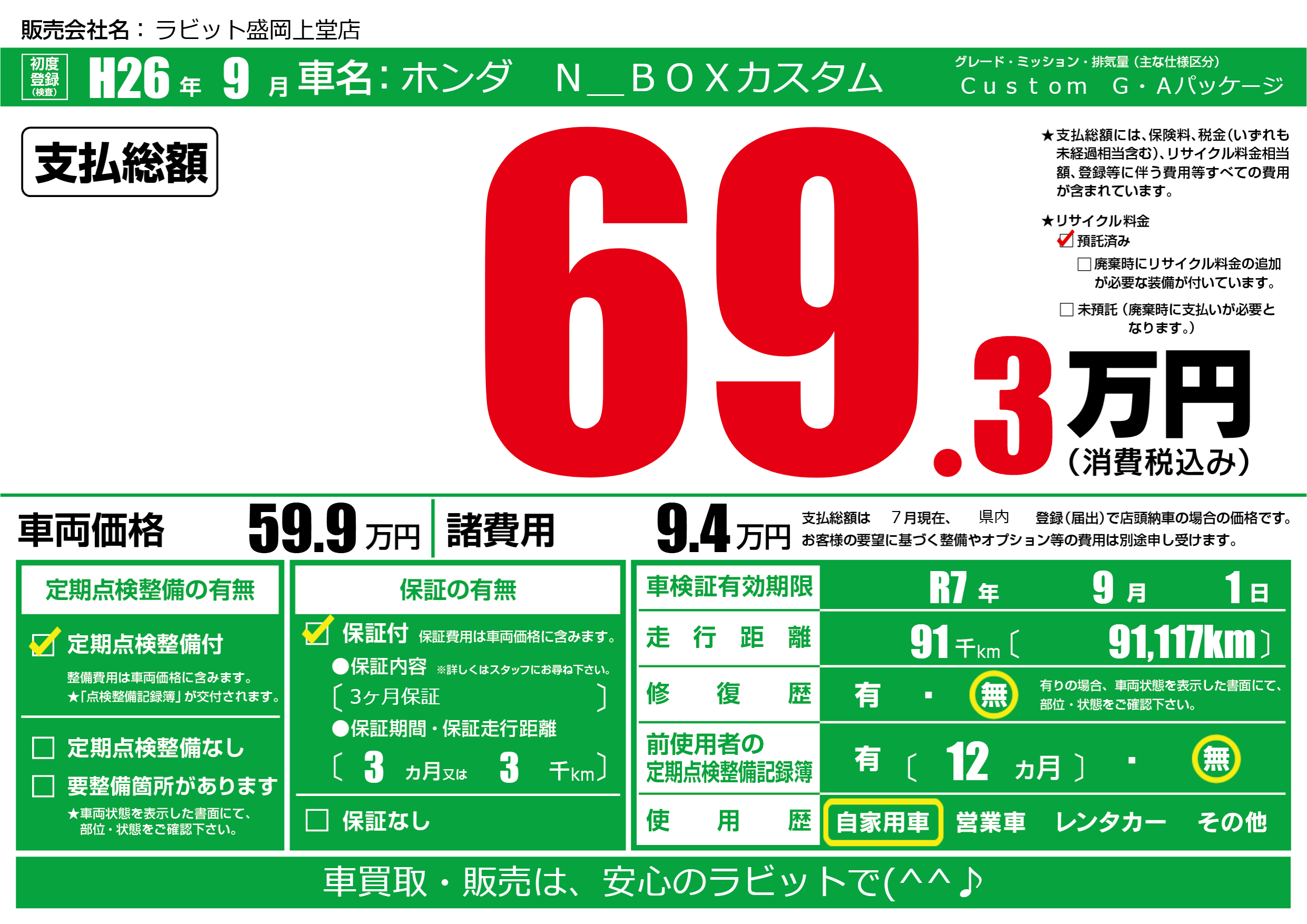 | 走行キロ | 9.1万km | 初年度登録 | H26年9月 |