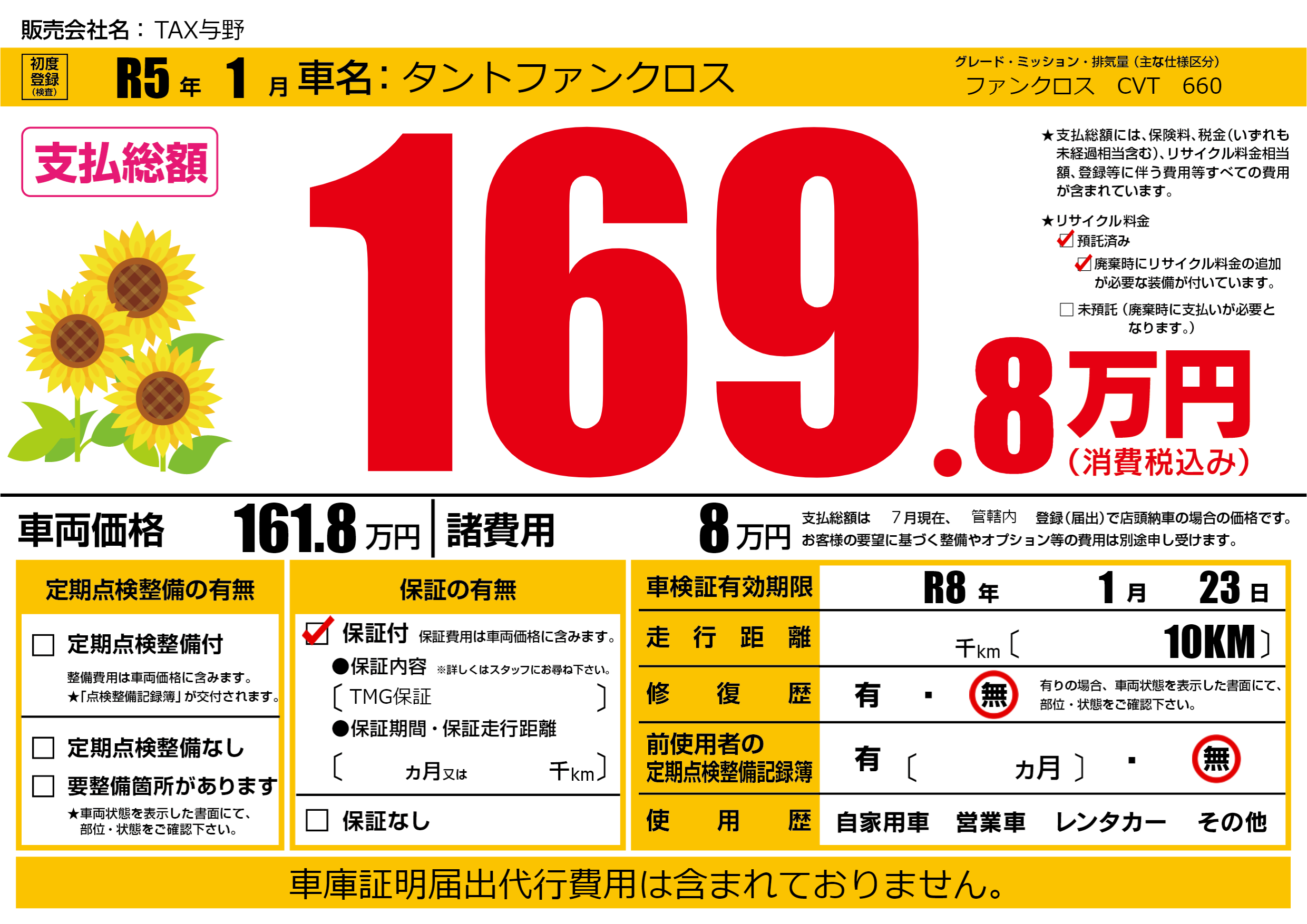 | 車名 | タントファンクロス | グレード ミッション 排気量 |