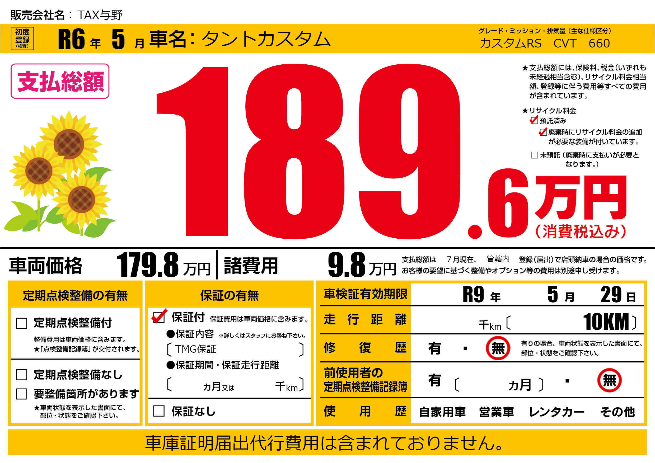 | 車名 | タントカスタム | グレード ミッション 排気量 |