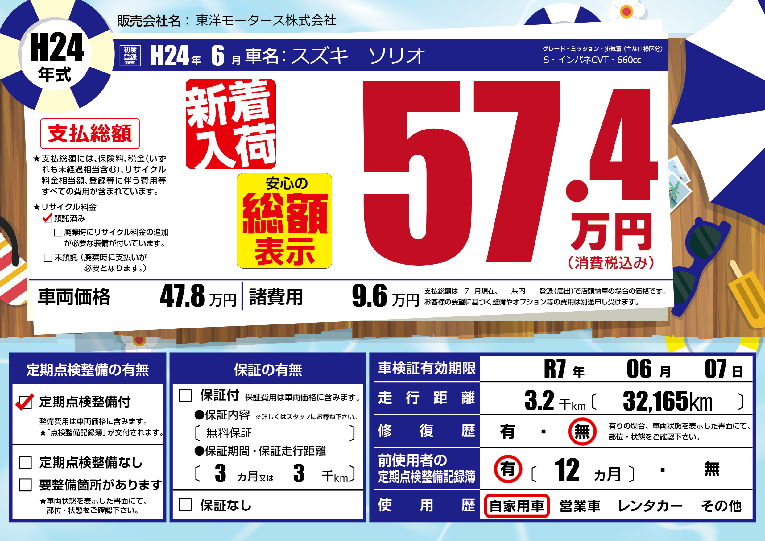 | 走行キロ | 0.3万km | 初年度登録 | H24年6月 |