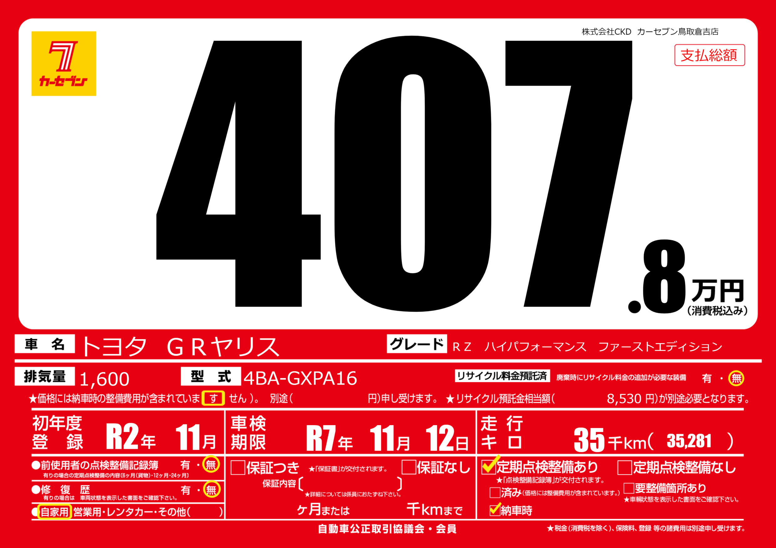 | 車名 | トヨタ GRヤリス | グレード ミッション 排気量 |