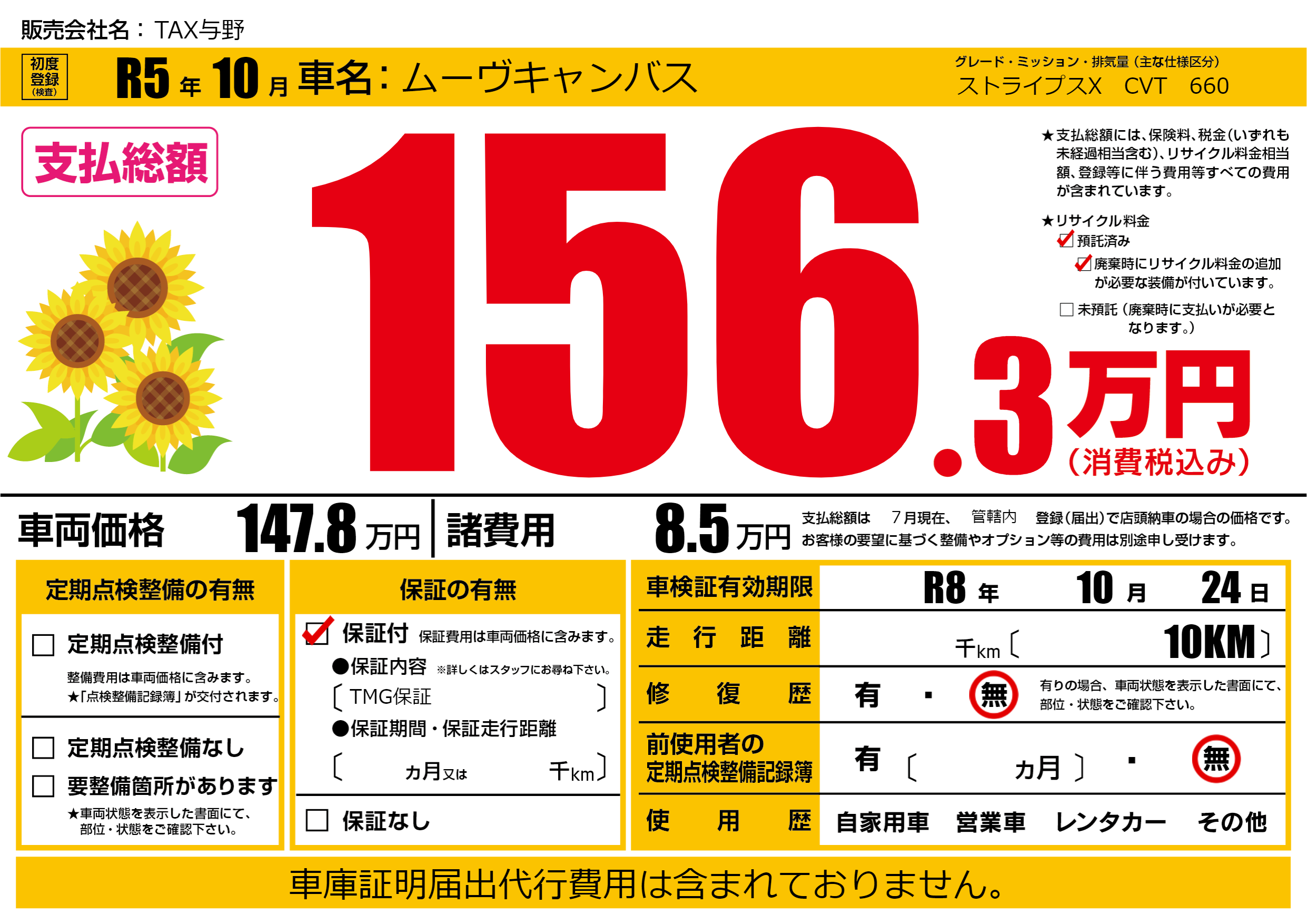 保証付き 保証内容(TMG保証) ---ヶ月または()千kmまで |
