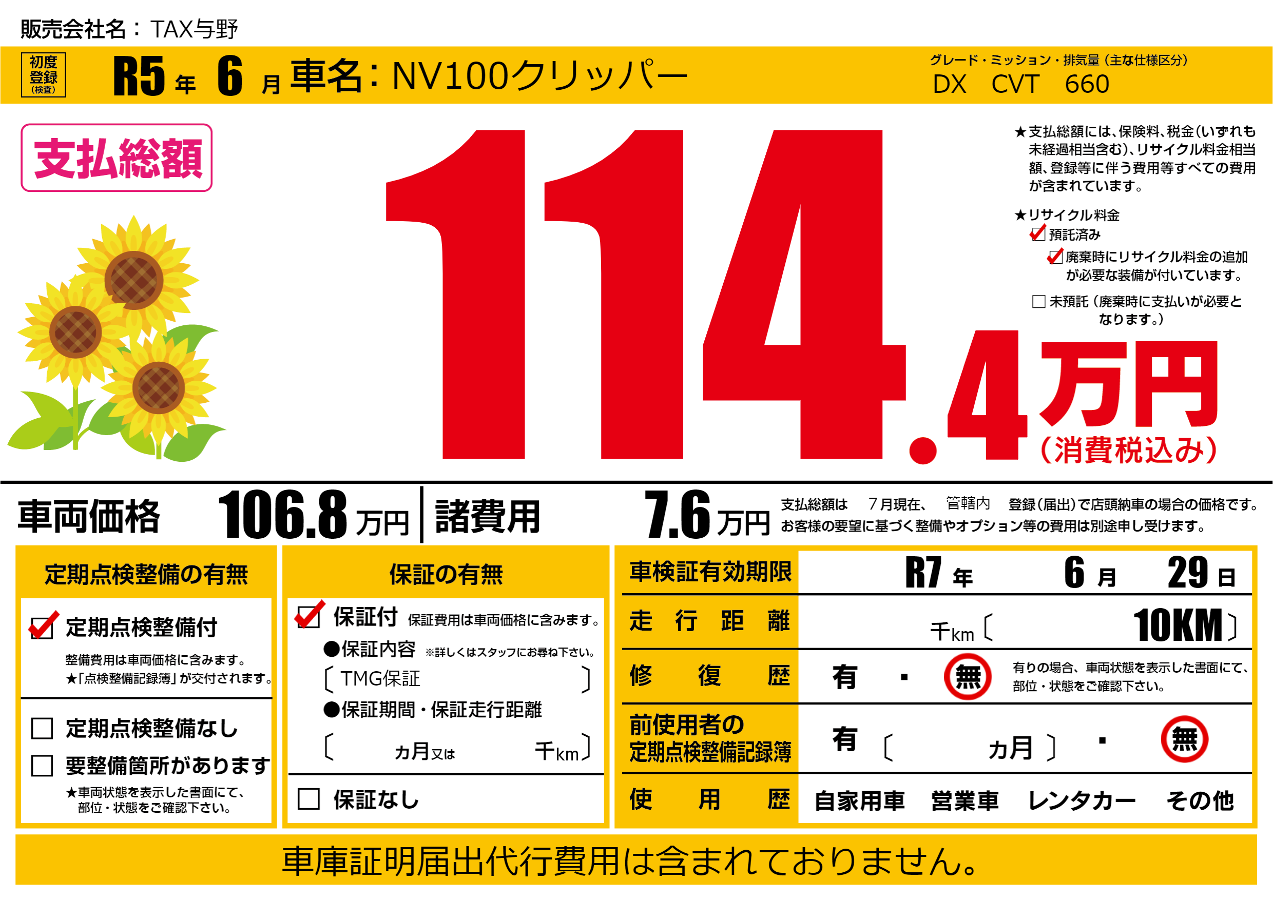 保証付き 保証内容(TMG保証) ---ヶ月または()千kmまで |