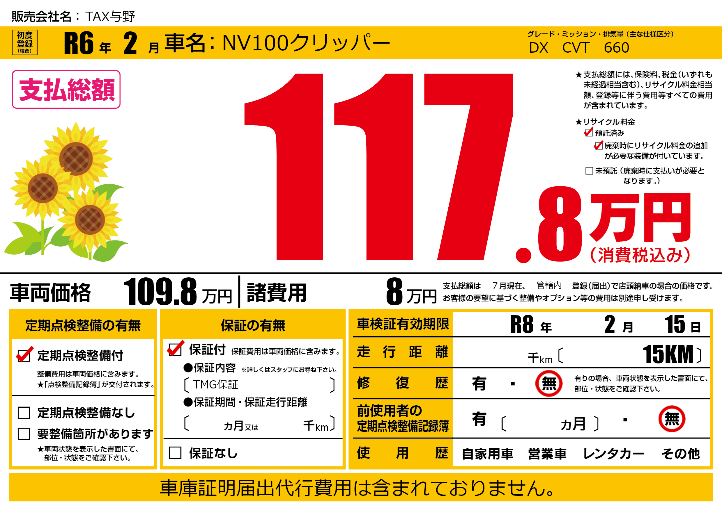 保証付き 保証内容(TMG保証) ---ヶ月または()千kmまで |
