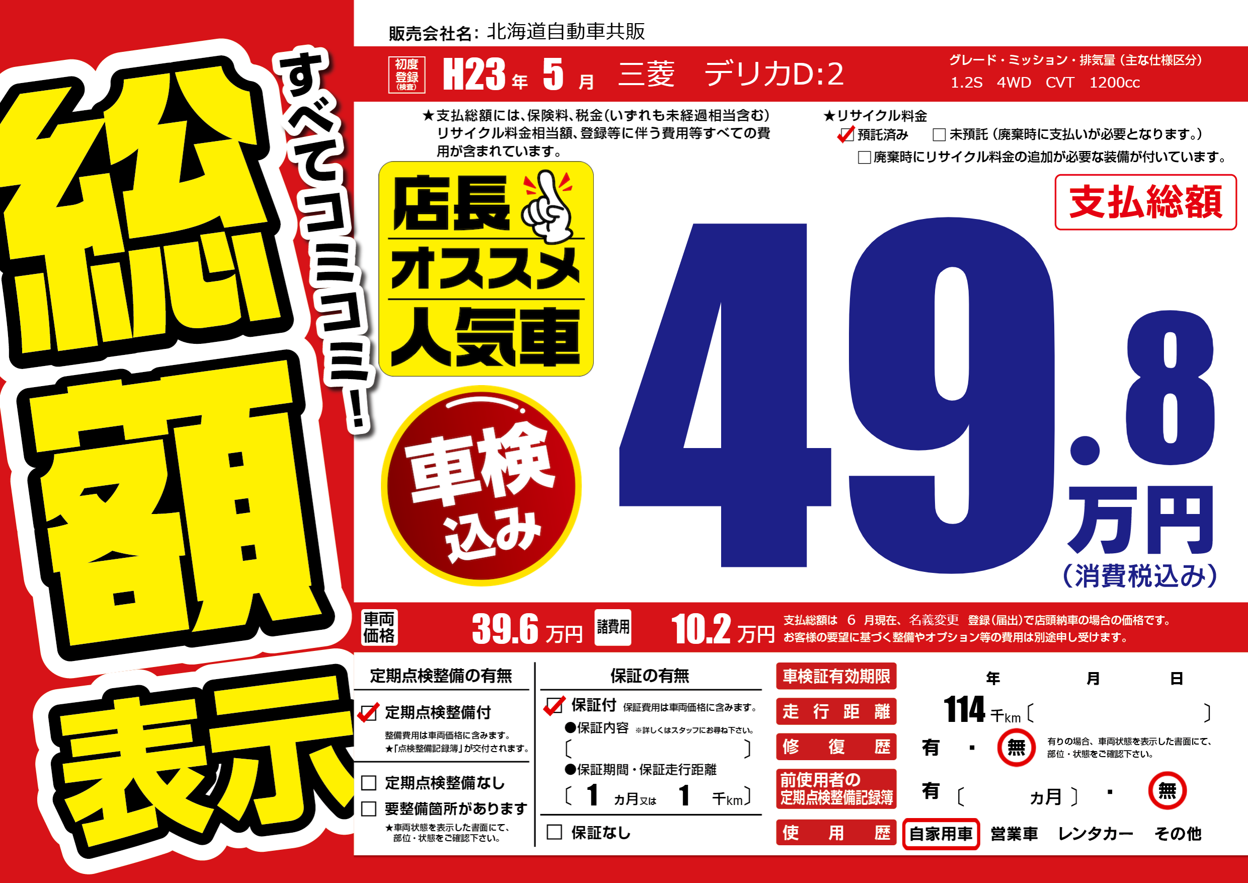 | 走行キロ | 11.4万km | 初年度登録 | H23年5月 |