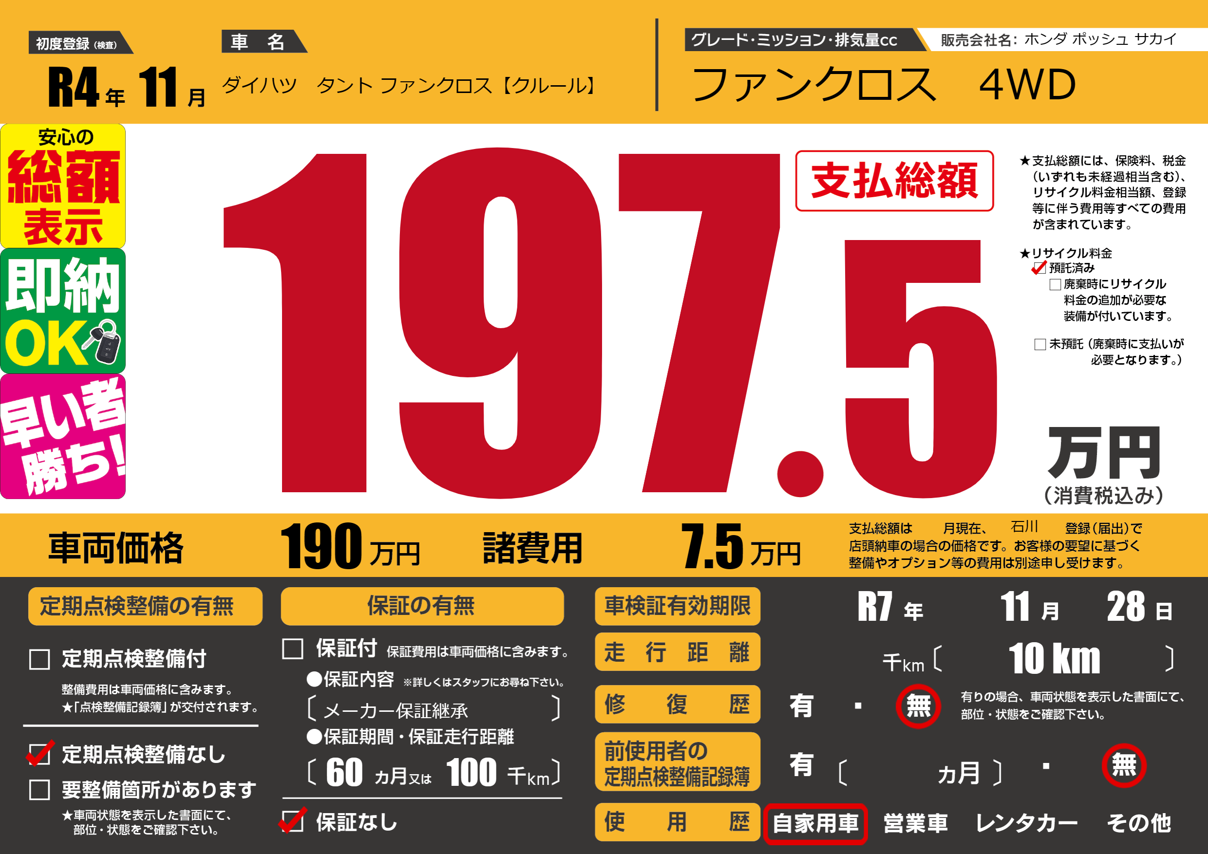 | 車名 | ダイハツ タント ファンクロス【クルール】 | グレード ミッション 排気量 |